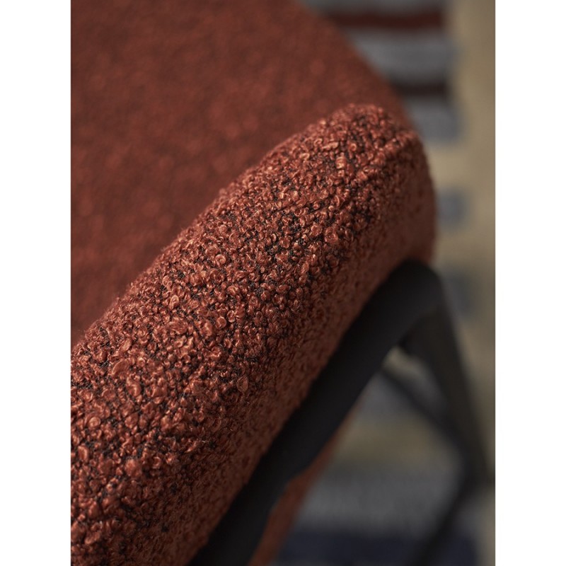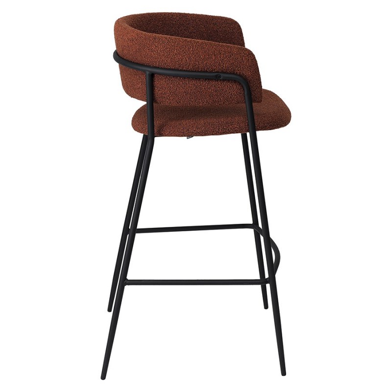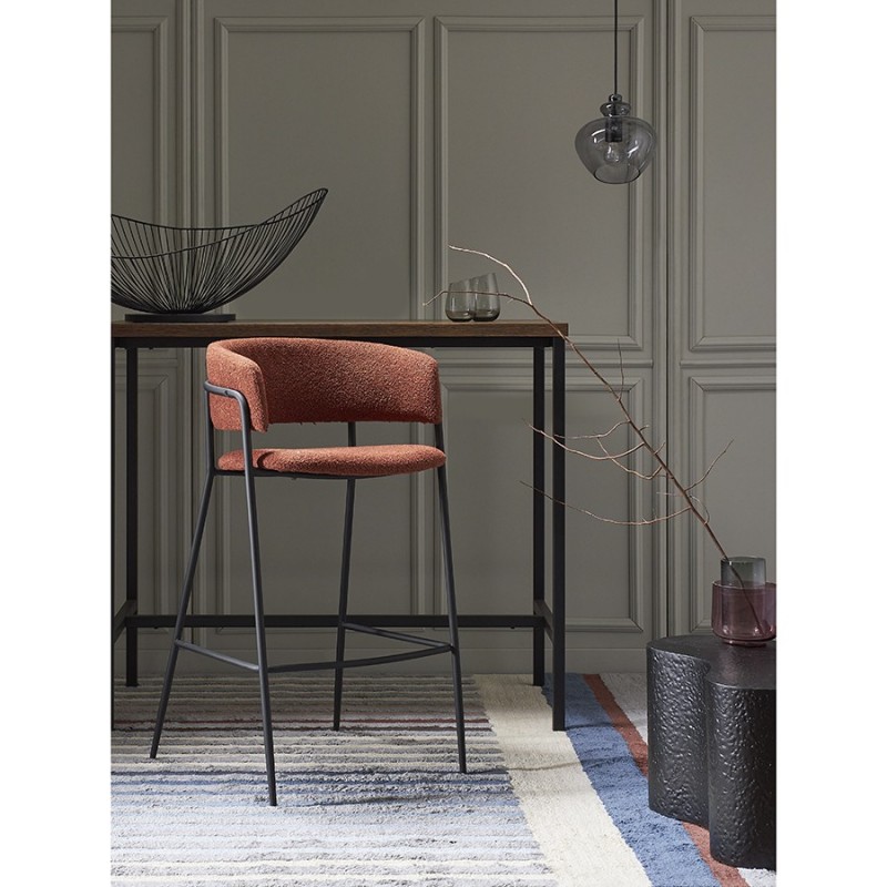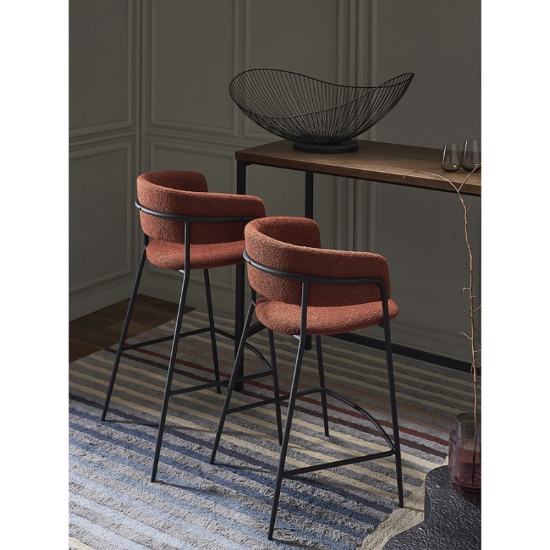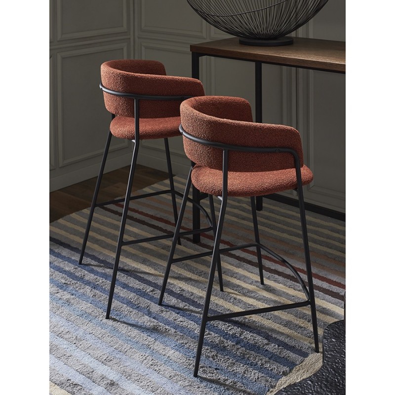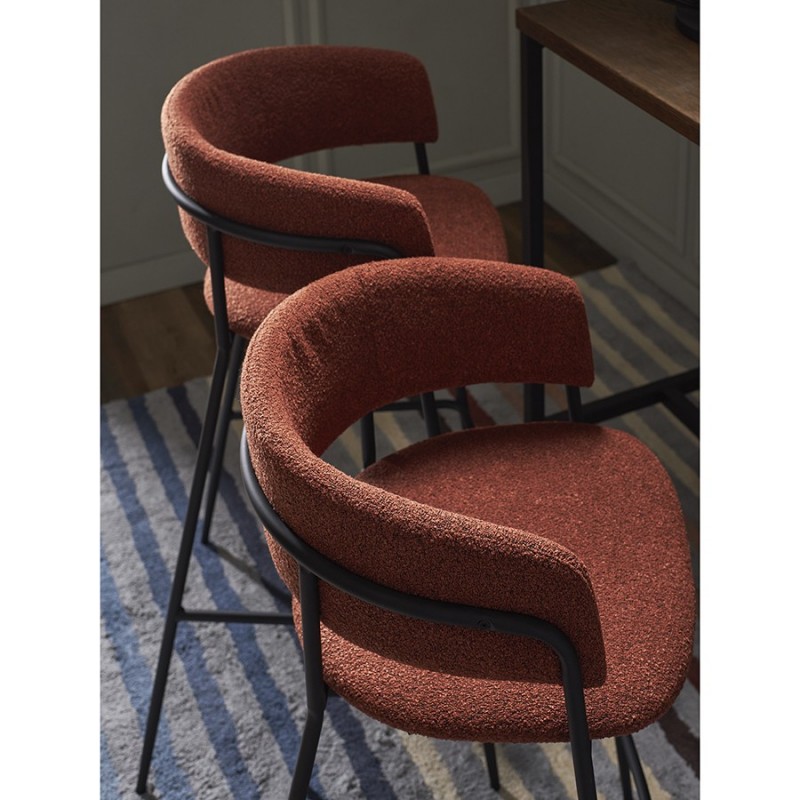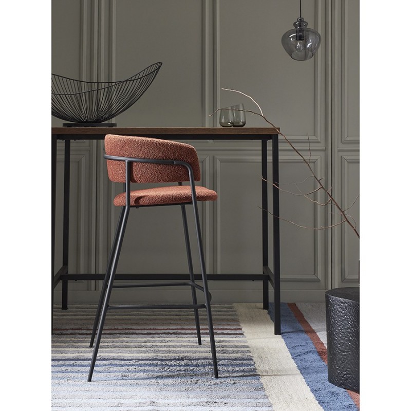 Стул барный Helning с буклированной обивкой непременно понравится любителям уюта и стильных предметов интерьера. Дизайнеры по всему миру выбирают мебель “букле”, так как она смотрится органично даже в самых минималистичных пространствах, добавляя оформлению особый шарм и глубину.Особенности и преимущества:- Буклированная обивка устойчива к износу и приятная на ощупь, на ней практически не видны затяжки и загрязнения. - Ножки стула изготовлены из железа с порошковым покрытием, которое защищает их поверхность от коррозии и механических повреждений. - Мягкое сиденье и спинка, плавно переходящая в подлокотники, обеспечивают комфортную посадку. - Стул цвета терракота легко сочетается с предметами интерьера различных оттенков, что позволяет экспериментировать с дизайном помещения.Материалы: железо, 100% полиэстер, фанера (тополь), пенополиуретан. Размеры: 46х54x102 см. Высота сиденья: 73 см. Ширина сиденья: 48,5 см. Глубина сиденья: 46 см. Высота спинки: 28 см. Ширина спинки: 46 см. Высота подножки: 31,5 см. Максимальная нагрузка: 120 кг. Цвет: терракота.Рекомендуется регулярно пылесосить мебель с помощью специальной насадки – резиновой или мягкой щетки. Образовавшиеся пятна можно удалять губкой или салфеткой со слабым мыльным раствором воды. Запрещается использовать абразивные материалы и агрессивную бытовую химию.