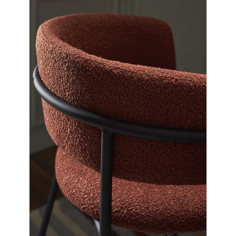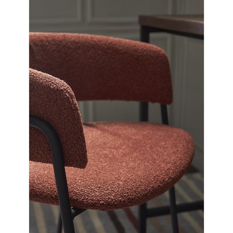 Стул барный Helning с буклированной обивкой непременно понравится любителям уюта и стильных предметов интерьера. Дизайнеры по всему миру выбирают мебель “букле”, так как она смотрится органично даже в самых минималистичных пространствах, добавляя оформлению особый шарм и глубину.Особенности и преимущества:- Буклированная обивка устойчива к износу и приятная на ощупь, на ней практически не видны затяжки и загрязнения. - Ножки стула изготовлены из железа с порошковым покрытием, которое защищает их поверхность от коррозии и механических повреждений. - Мягкое сиденье и спинка, плавно переходящая в подлокотники, обеспечивают комфортную посадку. - Стул цвета терракота легко сочетается с предметами интерьера различных оттенков, что позволяет экспериментировать с дизайном помещения.Материалы: железо, 100% полиэстер, фанера (тополь), пенополиуретан. Размеры: 46х54x102 см. Высота сиденья: 73 см. Ширина сиденья: 48,5 см. Глубина сиденья: 46 см. Высота спинки: 28 см. Ширина спинки: 46 см. Высота подножки: 31,5 см. Максимальная нагрузка: 120 кг. Цвет: терракота.Рекомендуется регулярно пылесосить мебель с помощью специальной насадки – резиновой или мягкой щетки. Образовавшиеся пятна можно удалять губкой или салфеткой со слабым мыльным раствором воды. Запрещается использовать абразивные материалы и агрессивную бытовую химию.