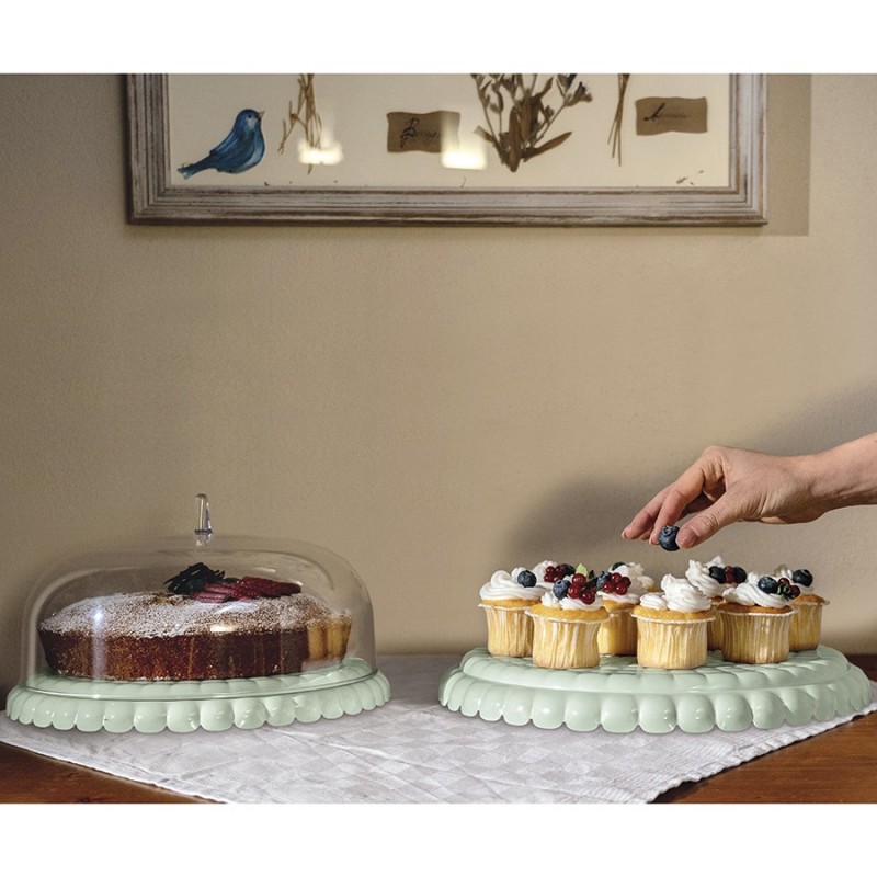 Блюдо сервировочное Tiffany станет украшением повседневного, праздничного стола или уютного чаепития на свежем воздухе. Его можно переворачивать и использовать с двух сторон. Сторона с загнутыми краями идеально подойдет для подачи мягкой выпечки и пирожных, а плоская идеальна для целых тортов и пирогов. Крышка в форме купола защитит продукты от заветривания, пыли и насекомых, что особенно важно во время трапез в саду или на открытой веранде. Рельефная форма в сочетании с прозрачным материалом заставляют поверхность посуды сверкать и переливаться на свету, делая ее центром притяжения взглядов.Блюдо изготовлено из высококачественного пластика, устойчивого к износу и повреждениям, крышка – из акрила. Материалы не содержат вредных примесей и бисфенола-А.Коллекция Tiffany от итальянского бренда Guzzini – это воплощение роскоши, оригинальности и утонченного вкуса. Создавая эту линейку, дизайнеры Пио и Тито Тозо вдохновлялись идеей непреходящего стиля и безупречности.Материалы: пластик SAN, акрил. Размеры: 36х36х18 см. Цвет: зеленый.Блюдо рекомендуется мыть вручную.