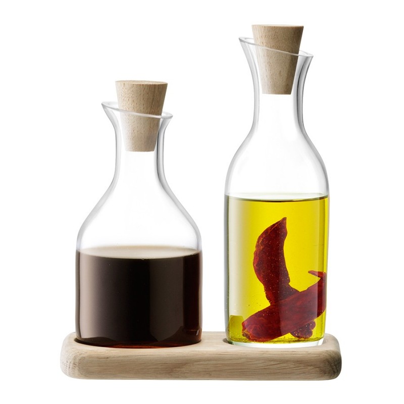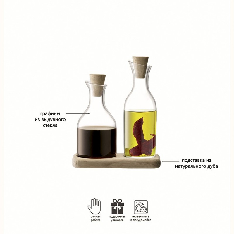 Элегантный набор из 2-х графинов из выдувного стекла и подставки из натурального дуба идеально подойдет для подачи растительного масла и уксуса. Он незаменим для сервировки салатов из свежих овощей, фокаччи, пиццы и других средиземноморских блюд. Набор упакован в красивую коробку и станет прекрасным подарком друзьям, коллегам, близким и всем, кто любит готовить.Serve — это элегантные формы, подчеркнутые кристальным блеском стекла ручной работы. Предметы коллекции подходят для сервировки в различных стилях. Линейка придется по душе всем, кто любит красивую и практичную посуду.Важно! Поскольку изделия изготавливаются вручную, их размер может незначительно отличаться и допускается наличие пузырьков в толще стекла: круглые < 3 мм, овальные < 5 мм и их небольшие скопления в виде пены. Также возможно наличие прожилок (видимых нитей) на стекле менее 50% длины окружности любого предмета. Все это не брак, а допустимые индивидуальные особенности товаров, произведенных ручным способом.Материал: выдувное стекло, дуб. Объем: 180 мл и 185 мл. Длина: 15 см. Ширина: 8,5 см.Графины рекомендуется мыть вручную в теплой мыльной воде и вытирать насухо мягкой тканью. Поднос можно протирать влажной тканью.