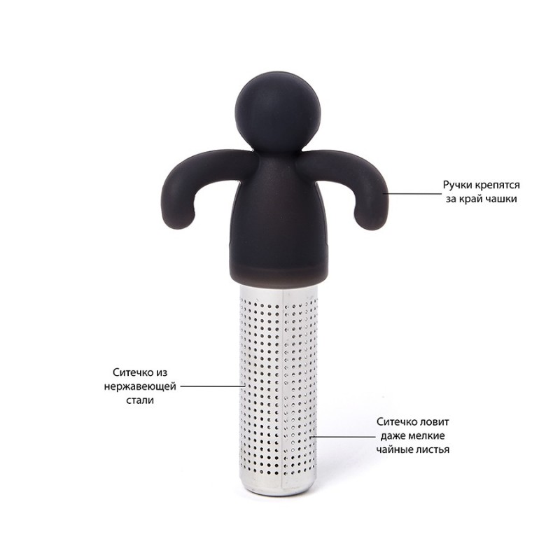 Емкость для завариваривания в форме забавного человечка подойдет для любой чашки и кружки.Аксессуар надежно крепится на стенку чашки. Ручки человечка легко гнутся в зависимости от формы кружки и прочно закрепляются на стенке. Крошечные отверстия на дне не дают заварке попасть в воду. Изделие отличается высокой прочностью. Материал не содержит бисфенола-А и меламина.Можно мыть в посудомоечной машине.