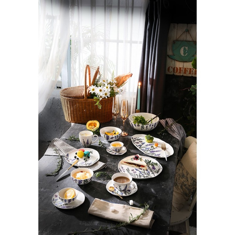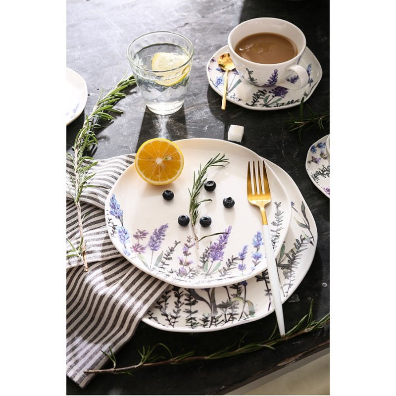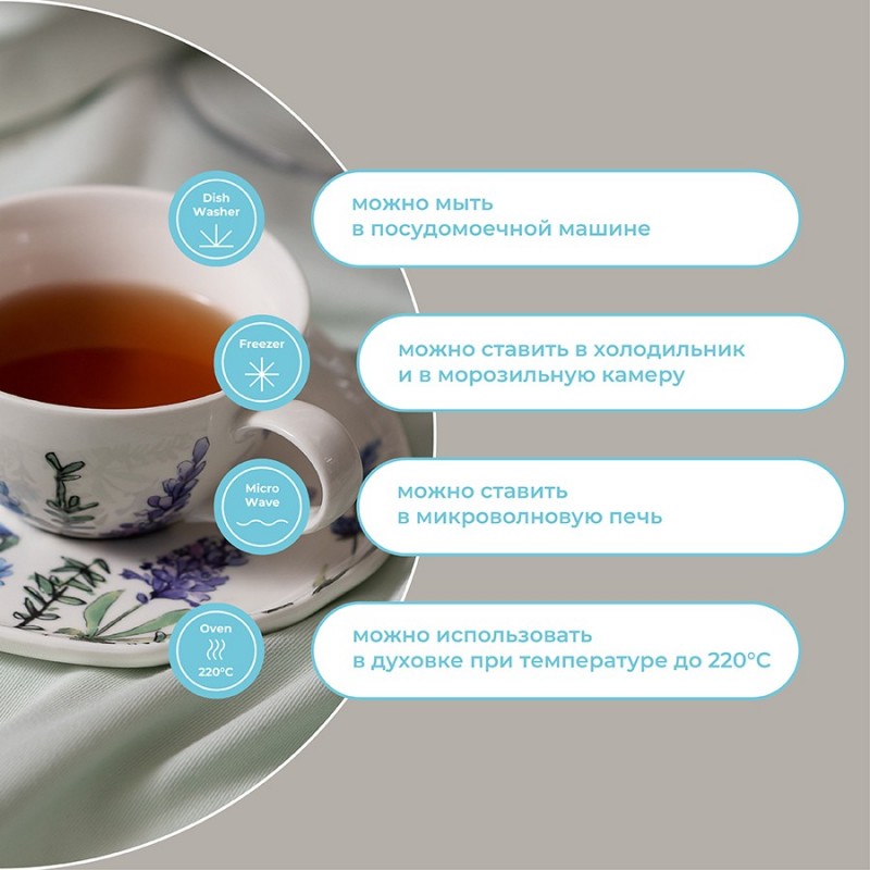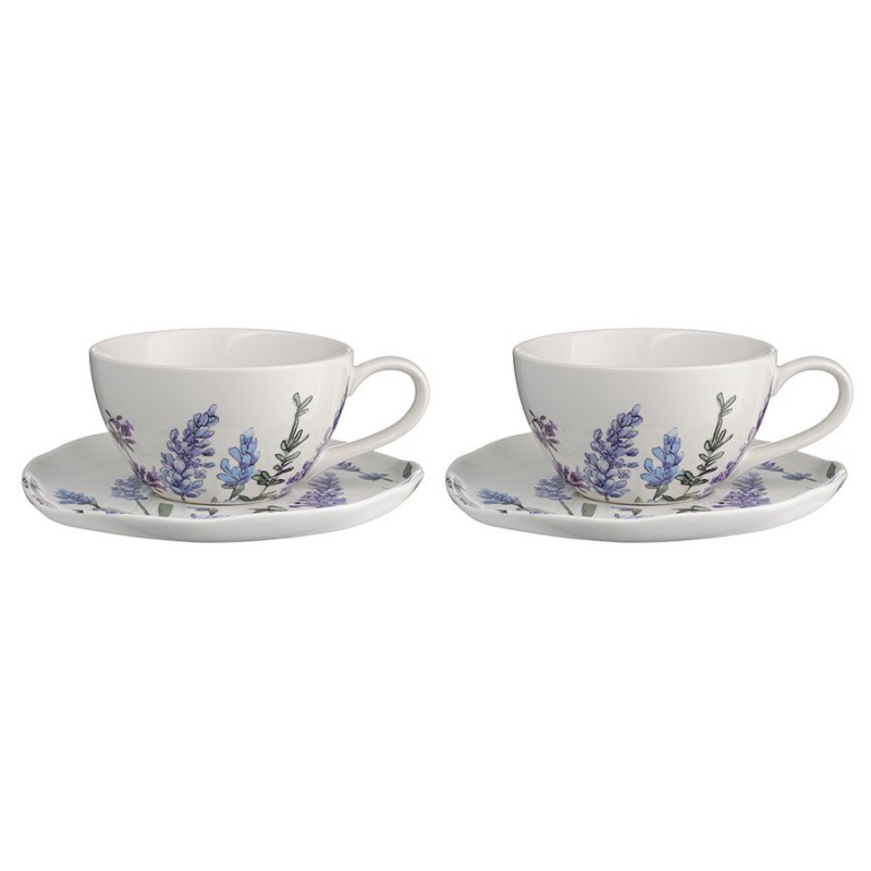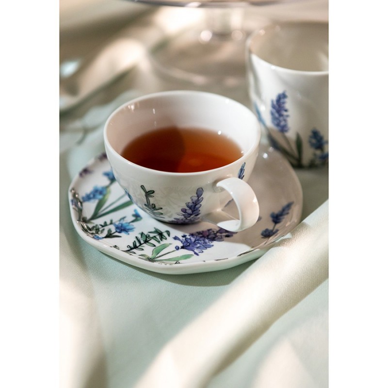Чашки с блюдцами из коллекции Floral – прекрасный вариант для всех, кто ценит сочетание качества и эстетики. Цветущая лаванда, изображенная на белоснежной поверхности, превращает посуду в настоящее украшение стола. Такая чайная пара идеально подходит для уютных чаепитий в стиле кантри и прованс. Материал изготовления неприхотлив в уходе, не впитывает загрязнения, является экологичным и безопасным для здоровья.Чистое сырье высочайшего качества и собственная формула глазуровки с обжигом при температуре 1250 °C делают изделия из фарфора особо прочными, устойчивыми к растрескиванию и появлению сколов. Глазурь и декор не тускнеют со временем, сохраняя первоначальный цвет и блеск. Наши продукты прошли испытания на отсутствие в составе свинца и кадмия в соответствии со стандартными тестами FDA.Материал: фарфор. Объем чашки: 250 мл. Диаметр блюдца: 16 см. Количество предметов в наборе: 4 шт.Посуду рекомендуется очищать от загрязнений в теплой воде с помощью мягкой губки с жидким средством. Допускается мытье в посудомоечной машине, использование в морозильной камере, микроволновой печи и духовке при температуре не выше 180 °C.
