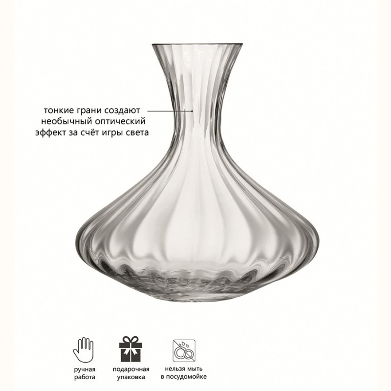 Добавьте изысканности вашей сервировке с декантером Aurelia. Изделие прекрасно подойдет для сервировки вина и воды со льдом и мятой. Комбинируйте его с бокалами, стаканами и другими предметами из коллекции Aurelia, чтобы создать завершенную композицию. Декантер упакован в красивую коробку, благодаря чему станет оригинальным подарком. Предметы коллекции Aurelia выполнены из прозрачного выдувного стекла. Особенности серии — тонкие грани и удлиненные ножки бокалов, создающие необычный оптический эффект за счет игры света. Изысканная и утонченная Aurelia — идеальный выбор для торжественных и официальных мероприятий.Важно! Поскольку изделие изготавливается вручную, его размеры могут незначительно отличаться и допускается наличие пузырьков в толще стекла: круглые < 3 мм, овальные < 5 мм и их небольшие скопления в виде пены. Также возможно наличие прожилок (видимых нитей) на стекле менее 50% длины окружности любого предмета. Все это не брак, а допустимые индивидуальные особенности товаров, произведенных ручным способом.Материалы: выдувное стекло. Объем: 1,8 л. Высота: 25 см. Ширина: 21 см.Рекомендуется мыть вручную в теплой мыльной воде и вытирать насухо мягкой тканью.