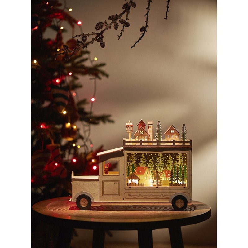 Декор новогодний с подсветкой Festive truck из коллекции New Year Essential принесет в ваш дом приятное ощущение радости и великолепно дополнит праздничный интерьер.Декор изготовлен в форме грузовика, украшенного новогодней аппликацией. Милый и трогательный образ эффектно подчеркивает специальная подсветка, которая добавляет украшению особый шарм и создает праздничную атмосферу. Долгими зимними вечерами Festive truck будет согревать ваш дом уютными огоньками и поможет поверить в чудеса. Изделие выполнено из фанеры, что обеспечивает ему прочность и долговечность. Для работы требуются 2 батарейки типа АА, которые не входят в комплект.Материал: фанера. Размеры: 40х8,8х30 см.
