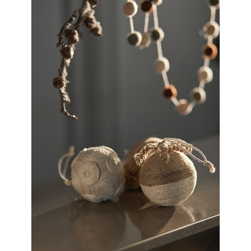 Набор елочных шаров Zero waste из джута из коллекции New Year Essential привнесет в интерьер ностальгические нотки и напомнит о временах, когда новогодние украшения создавались вручную и носили особенный характер.Особенности и преимущества:- Шары из джута смотрятся необычно, что позволяет использовать их в качестве интересных акцентов. - Благодаря устойчивому к износу материалу украшения будут служить ни один год, сохраняя привлекательный вид. - Игрушки уже оснащены веревочками, за которые их можно легко подвешивать на ёлку.Материал: джут. Размеры: 7,5х7,5х10 см. Количество украшений в наборе: 4 шт.