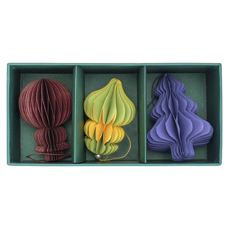 Набор украшений из бумаги Honeycomb festive из коллекции New Year Essential – простой способ добавить в новогодний наряд вашей ёлки стильный акцент и привнести в праздничный интерьер нотку ностальгии и уюта.Особенности и преимущества:- Легкие украшения из бумаги подходят как для искусственных, так и натуральных елей. - Игрушки уже идут с нитками, что позволяет легко разместить их на еловых ветках или предметах интерьера. - Елочные украшения оснащены магнитами, благодаря чему удобно складываются для компактного хранения. - Бумажные фигурки различных цветов великолепно дополняют друг друга и отлично сочетаются со всевозможным декором. - Акценты в виде бусин делают дизайн украшений более утонченным и элегантным.Материал: бумага. Размеры: 6х6х9,5 см; 7х7х10 см; 6,5х6,5х8,5 см. Количество украшений в наборе: 3 шт.