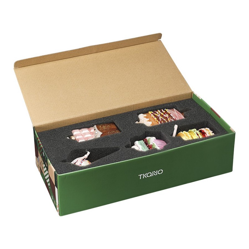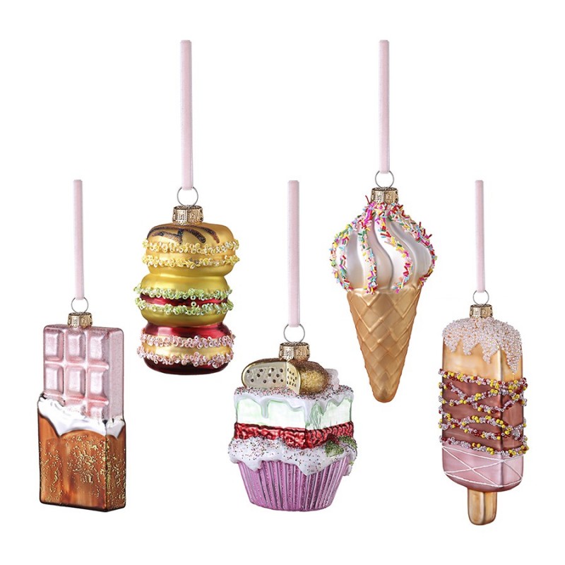 Добро пожаловать в мир сладких сюрпризов с набором ёлочных украшений Glimmer из коллекции New Year Essential! Эти волшебные угощения добавят яркие краски и радостные эмоции в каждое мгновение праздника. Представьте себе сияние огоньков, отражающееся в глазури мороженого или плитке шоколада, – невероятное зрелище, не правда ли?Особенности и преимущества:- Яркий, запоминающийся дизайн. - Долговечный материал. - Наличие петелек для подвешивания на елку и предметы интерьера.Материал: стекло. Размеры: 6х2,5х15 см; 5,1х2,1х12,7 см; 5,7х5,7х10,9 см; 7х4,5х10,4 см; 5,7х5,7х14,5 см. Количество в наборе: 5 шт.