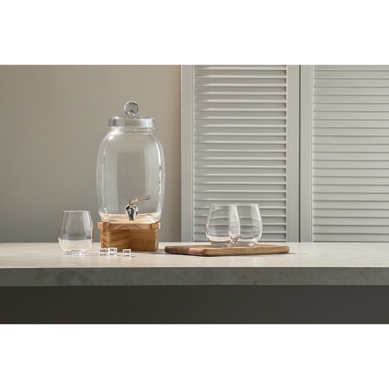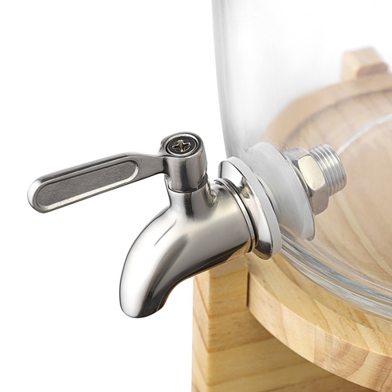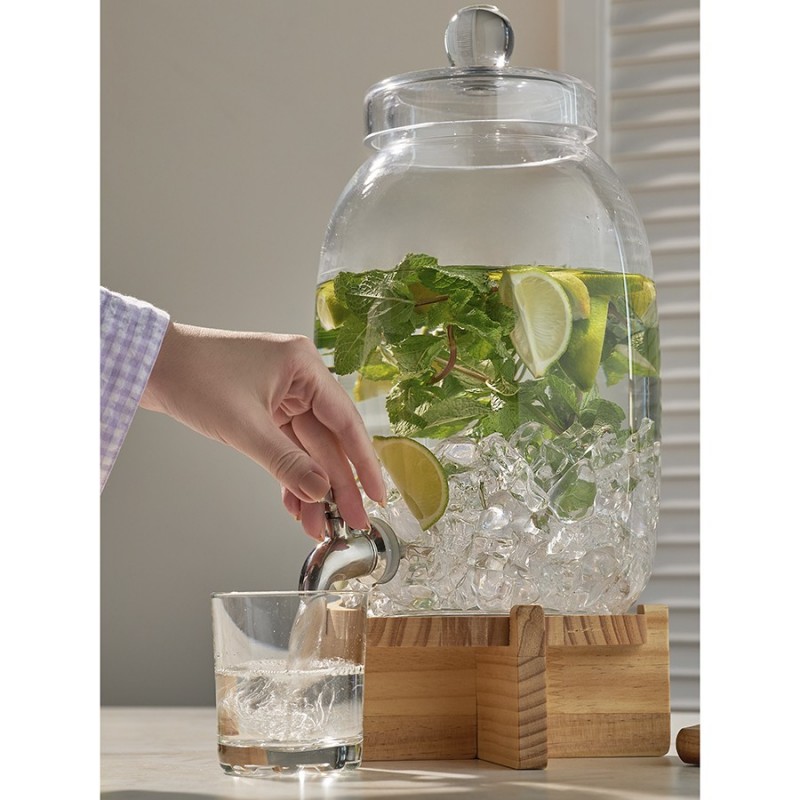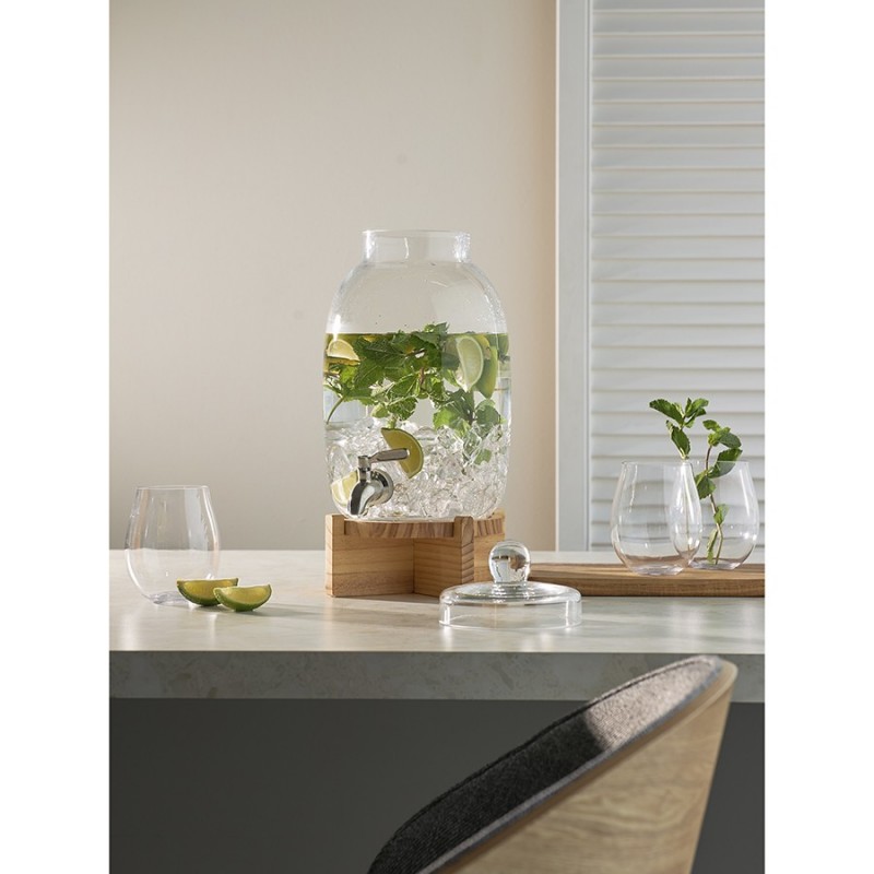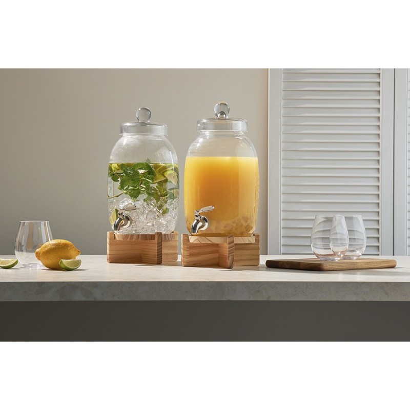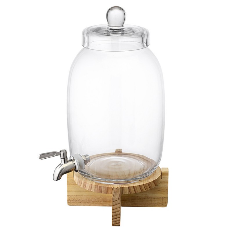Диспенсер на деревянной подставке Flo – прекрасное решение для кухни или бара. Этот стильный и удобный в использовании аксессуар станет изюминкой любой сервировки и облегчит процесс подачи напитков гостям. Он отлично подойдет для морса, лимонада, кваса, сока и других холодных напитков.Особенности и преимущества:- Емкость выполнена из боросиликатного стекла, известного своей высокой прочностью и долговечностью. - Для хорошей устойчивости предусмотрена подставка из древесины сосны, которая также добавляет дизайну изюминку. - При объеме 5,4 л диспенсер имеет компактные размеры, благодаря чему не занимает много места. - Удобная конструкция с краником позволяет легко наполнять стаканы или бокалы напитками, исключая их проливание.Материалы: боросиликатное стекло, нержавеющая сталь, сосна. Размеры: 16х16х39 см. Объем: 5,4 л.Диспенсер рекомендуется мыть вручную. Подставку можно очищать мягкой влажной губкой или салфеткой. Изделие из натурального дерева запрещается замачивать в воде, а также использовать для его очищения абразивные материалы и агрессивную бытовую химию.