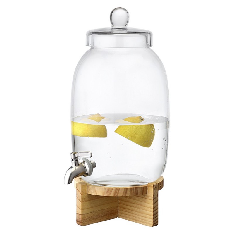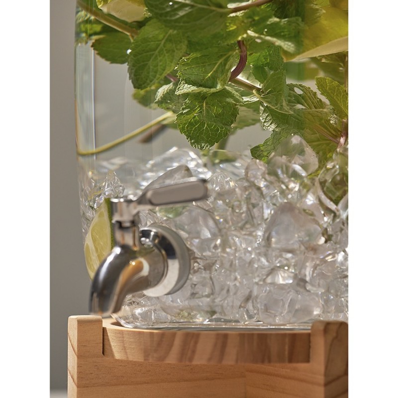 Диспенсер на деревянной подставке Flo – прекрасное решение для кухни или бара. Этот стильный и удобный в использовании аксессуар станет изюминкой любой сервировки и облегчит процесс подачи напитков гостям. Он отлично подойдет для морса, лимонада, кваса, сока и других холодных напитков.Особенности и преимущества:- Емкость выполнена из боросиликатного стекла, известного своей высокой прочностью и долговечностью. - Для хорошей устойчивости предусмотрена подставка из древесины сосны, которая также добавляет дизайну изюминку. - При объеме 5,4 л диспенсер имеет компактные размеры, благодаря чему не занимает много места. - Удобная конструкция с краником позволяет легко наполнять стаканы или бокалы напитками, исключая их проливание.Материалы: боросиликатное стекло, нержавеющая сталь, сосна. Размеры: 16х16х39 см. Объем: 5,4 л.Диспенсер рекомендуется мыть вручную. Подставку можно очищать мягкой влажной губкой или салфеткой. Изделие из натурального дерева запрещается замачивать в воде, а также использовать для его очищения абразивные материалы и агрессивную бытовую химию.