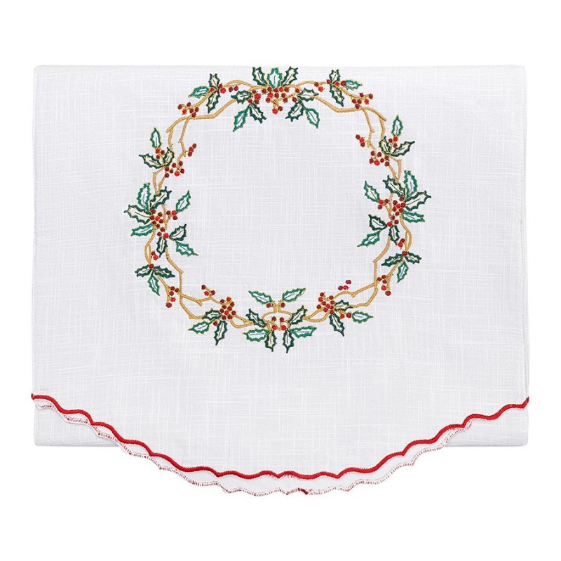 Дорожка Festive wreath из коллекции New Year Essential – простой способ сделать акцент на деталях сервировки и создать особую атмосферу за столом. Вышивка в виде хвойных веточек и ягод воплощает символику праздника, напоминая о новогоднем волшебстве, подарках и уютных вечерах в кругу семьи и друзей. Дорожка поможет защитить столешницу от пятен, царапин и обозначить посадочные места для гостей.Особенности и преимущества:- Дорожка выполнена из экологичного, прочного и долговечного 100% хлопка. - Материал выдерживает многократные стирки, сохраняя цвет и первоначальное качество. - Ручная вышивка придает изделию особую ценность, делает дизайн уникальным.Материал: 100% хлопок. Плотность: 160 г/м2. Размер: 45х150 см.! Стирка запрещена ! Гладить запрещено ! Барабанная сушка запрещена ! Не отбеливать ! Сухая чистка запрещена ! Допускается ручная чистка пятен