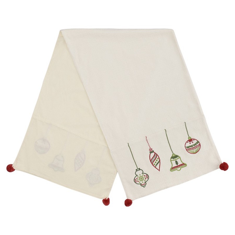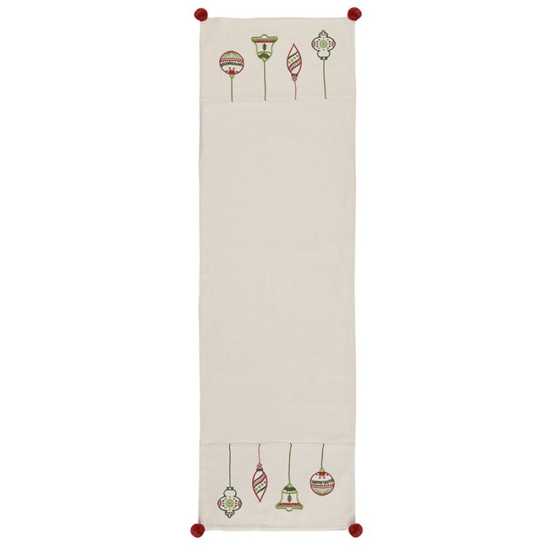 Дорожка с вышивкой Christmas decorations из коллекции New Year Essential – оригинальный текстильный аксессуар, который превратит повседневную сервировку в праздничную, а вашу кухню или столовую – в стильное и уютное пространство.Особенности и преимущества:- Выполнена из экологичного, устойчивого к износу и деформации 100% хлопка. - Идеально подходит для повседневной и праздничной сервировки, может использоваться для обозначения мест при рассадке гостей. - Благодаря дизайну в этно-стиле с элементами в виде вышивки и кисточек привносит в интерьер интересный акцент. - Позволяет защитить поверхность стола от воздействия горячих температур, царапин и пятен.Основной материал: 100% хлопок. Материал декоративных элементов: хлопок-полиэстер. Размеры: 45х150 см.! Стирка запрещена ! Гладить запрещено ! Барабанная сушка запрещена ! Не отбеливать ! Возможна сухая чистка