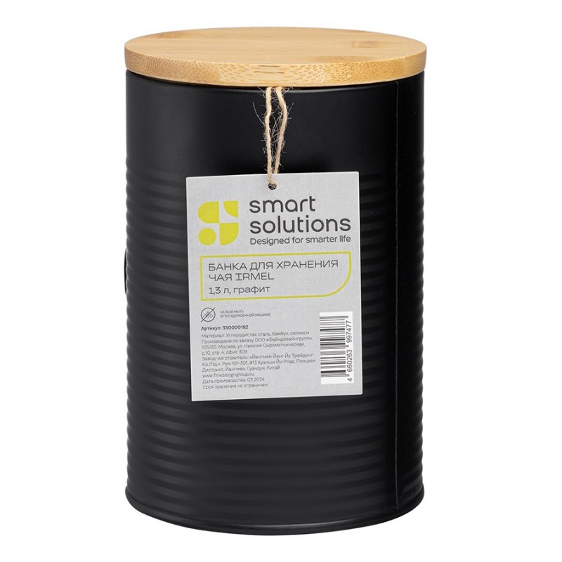 Банка для хранения чая Irmel от бренда Smart Solutions станет прекрасным дополнением современного кухонного интерьера. Ее дизайн органично вписывается в различные стилевые решения: минимализм, лофт, фьюжн, эклектика, афро, сканди и другие.Особенности и преимущества:- Использование в изготовлении углеродистой стали гарантирует емкости отличные эксплуатационные характеристики – устойчивость к повреждениям, износу и простой уход. - Порошковое покрытие защищает металлическую поверхность от коррозии и обеспечивает изделию дополнительную прочность. - Крышка из бамбука с силиконовым уплотнителем плотно прилегает, исключая попадание внутрь банки пыли и влаги.Материалы: углеродистая сталь, бамбук, силикон. Размеры: 11х11х15,8 см. Объем: 1,3 л. Цвет: графит.Загрязнения рекомендуется удалять при помощи мягкого влажного материала. После очищения банку необходимо вытереть насухо. Запрещается мытье в посудомоечной машине, использование абразивов и агрессивной бытовой химии.