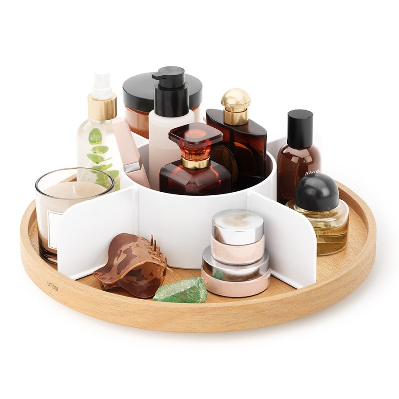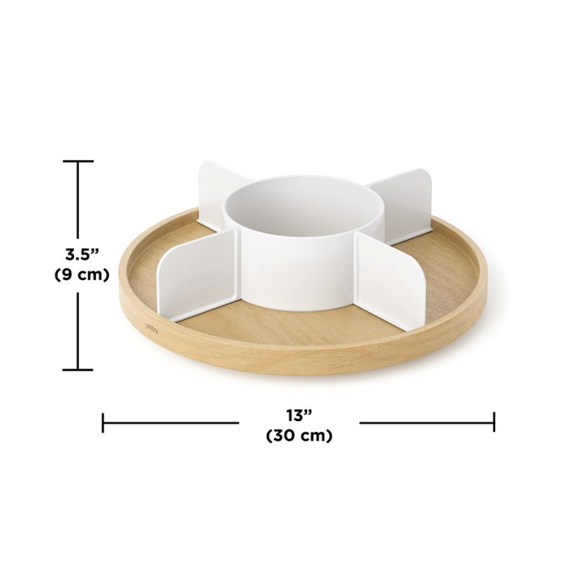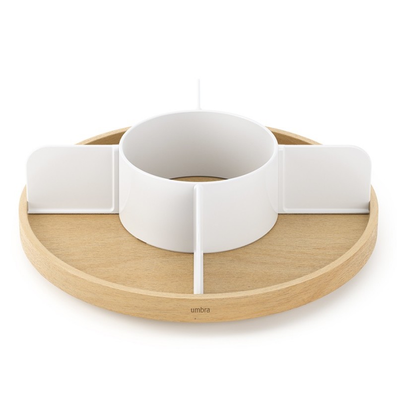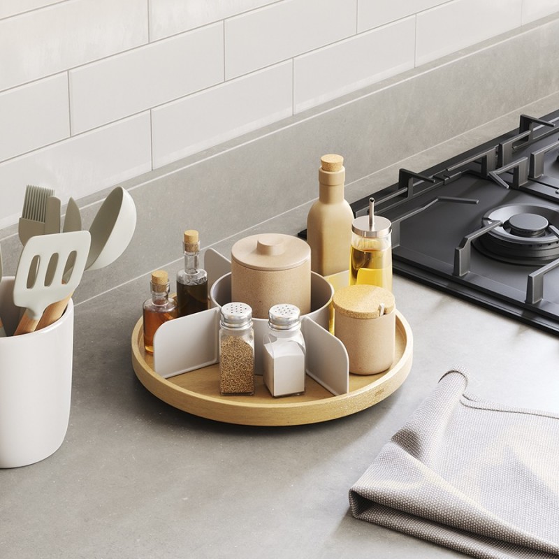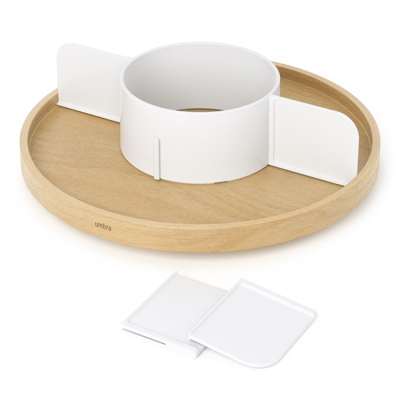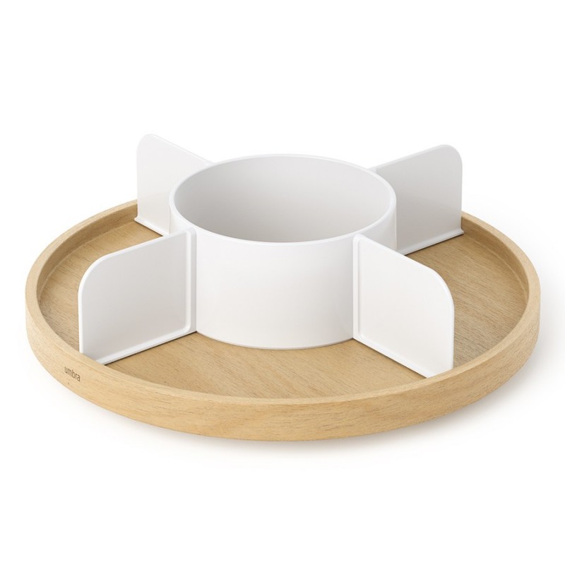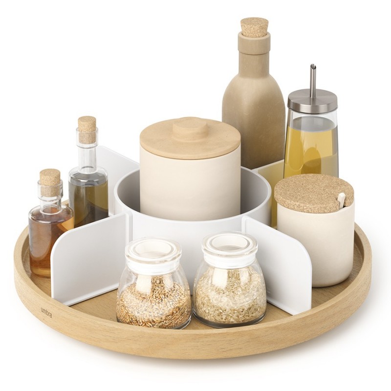 Органайзер Bellwood поможет организовать компактное хранение специй на полке или столешнице, а также обеспечить быстрый доступ к любой приправе за счет вращающейся конструкции. Органайзер имеет пять отделений, что делает его вместительным и позволяет раздельно хранить различные продукты: банки со специями, бутылки с маслом, уксусом, соусом и многое другое. Сочетание дерева и пластика подходит для различных интерьерных решений и гарантирует изделию устойчивость к износу и долгий срок службы.Материалы: тополь, переработанный АБС-пластик, бук, сталь, силикон. Размеры: 30х30х9 см. Цвет: белый/натуральное дерево.Пыль и загрязнения с поверхностей можно удалять при помощи мягкого влажного материала. Запрещается использование абразивов и агрессивной бытовой химии.