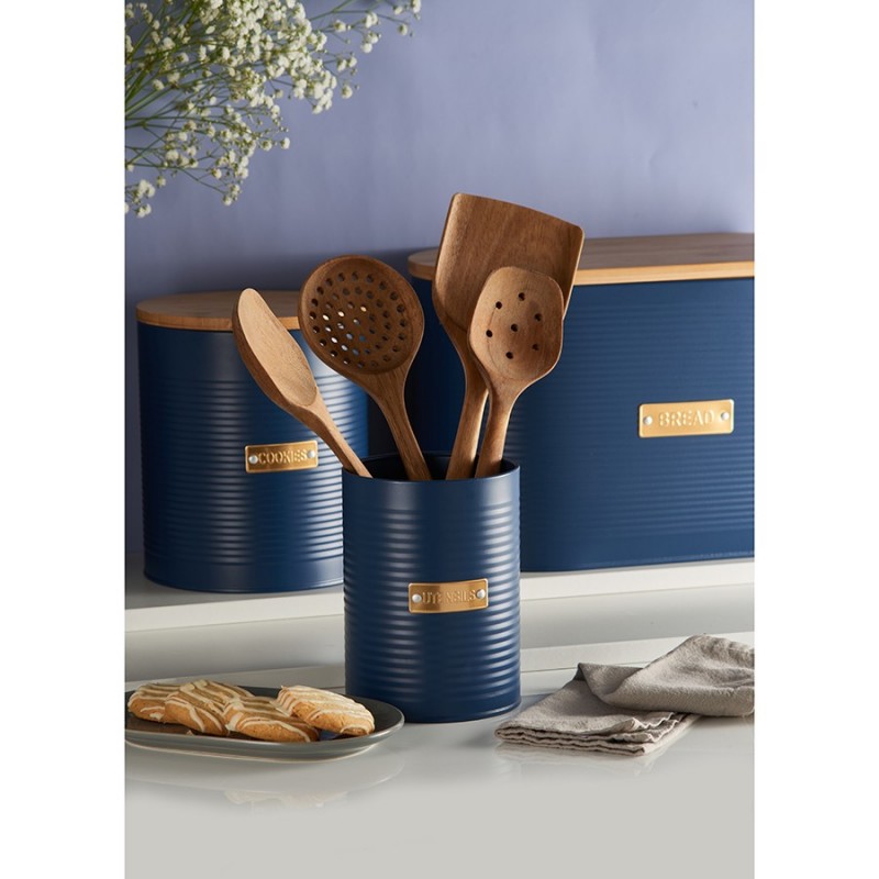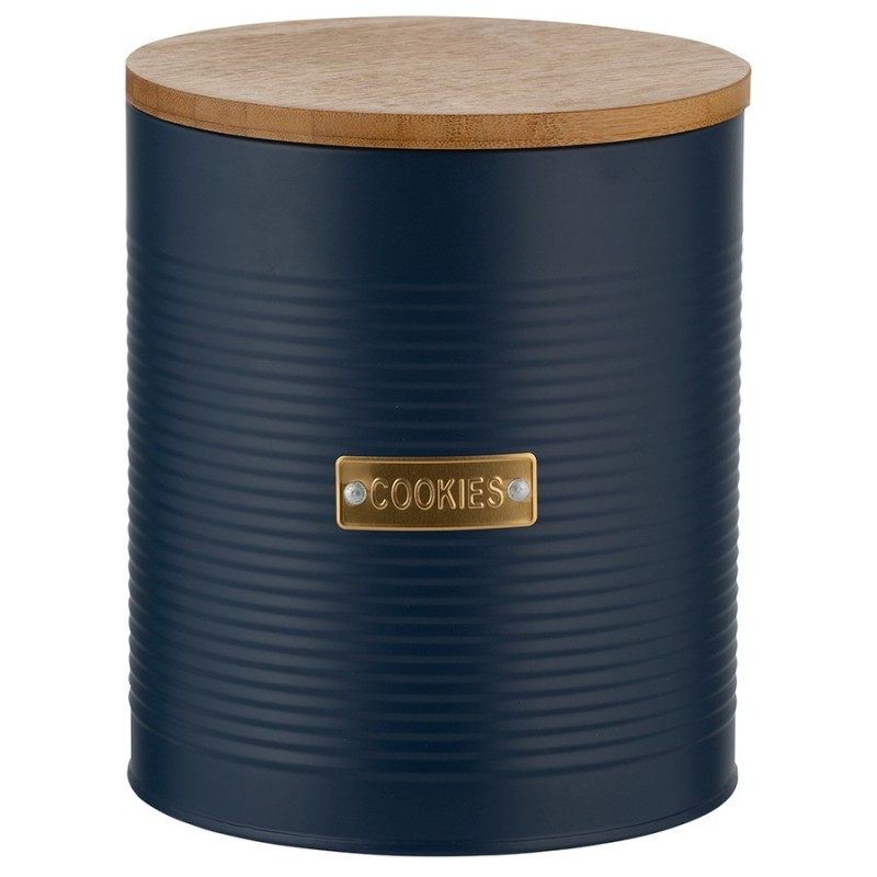 Банка для печенья из коллекции Otto – удобное решение для хранения сыпучих продуктов и стильный элемент кухонного интерьера. Эргономичный контейнер выполнен из прочной, устойчивой к коррозии и деформации углеродистой стали. Плотно прилегающая бамбуковая крышка с силиконовым уплотнителем защищает содержимое банки от заветривания и отсыревания. Рельефная поверхность и красивое сочетание золотистого декора с матовым покрытием насыщенного синего цвета делает дизайн интересным. Такая посуда отлично вписывается в интерьер, оформленный в классическом и современном стиле.Материалы: углеродистая сталь, бамбук, силикон. Объем: 2,6 л. Цвет: синий.Перед первым использованием емкость рекомендуется хорошо вымыть вручную в теплой воде с мягким моющим средством. Запрещается применение абразивных материалов и агрессивной бытовой химии.