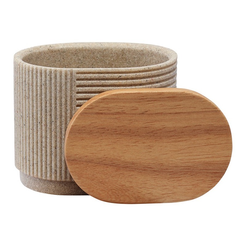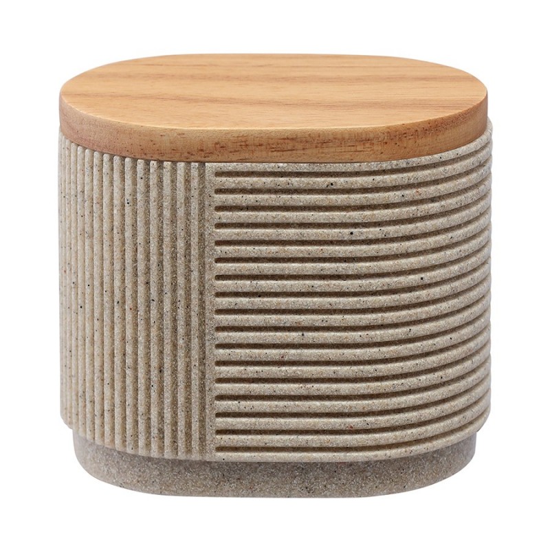Банка для хранения Dune – отличное решение для тех, кто любит сочетание базовых оттенков и необычных фактур. Вы можете хранить в ней средства гигиены и другие предметы, а также использовать в качестве декоративного элемента.Особенности и преимущества:- Полирезин – экологичный, прочный, легкий, непористый материал, который не впитывает влагу и загрязнения, легко очищается и не бьется при падении. - Крышка из каучукового дерева позволяет защитить содержимое банки от попадания влаги и добавляет в дизайн нотки природной элегантности. - Аксессуары базового песочного оттенка позволяют создать в интерьере теплую, уютную атмосферу и отлично комбинируются с предметами любых цветов.Материал: полирезин, каучуковое дерево. Размеры: 10,1х7х18,9 см. Цвет: песочный.Можно очищать в теплой воде с помощью мягких моющих средств. Запрещается использование агрессивной бытовой химии и абразивных материалов.