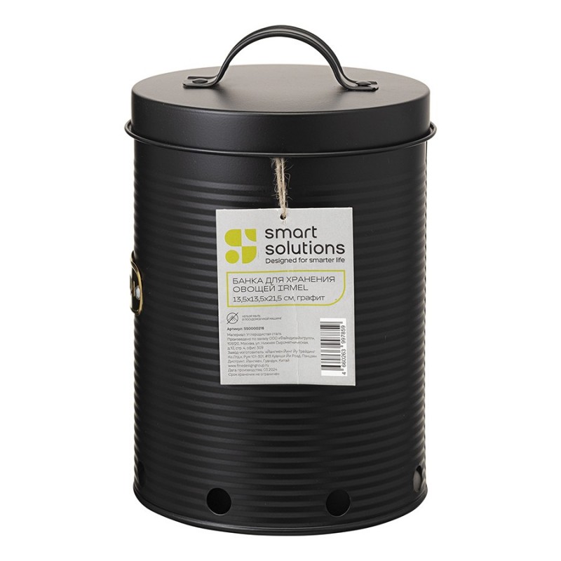 Банка для хранения овощей Irmel от бренда Smart Solutions станет прекрасным дополнением современного кухонного интерьера. Ее дизайн органично вписывается в различные стилевые решения: минимализм, лофт, фьюжн, эклектика, афро, сканди и другие.Особенности и преимущества:- Углеродистая сталь, из которой выполнена емкость, устойчива к повреждениям, износу, не требует специального ухода. - Порошковое покрытие защищает металлическую поверхность от коррозии и обеспечивает изделию дополнительную прочность. - На корпусе банки предусмотрены вентиляционные отверстия для предотвращения отсыревания продуктов и появления плесени. - Наличие крышки исключает попадание внутрь пыли, влаги и солнечных лучей.Материал: углеродистая сталь. Размеры: 14х14х21,5 см. Объем: 2,5 л. Цвет: графит.Загрязнения рекомендуется удалять при помощи мягкого влажного материала. После очищения банку необходимо вытереть насухо. Запрещается мытье в посудомоечной машине, использование абразивов и агрессивной бытовой химии.