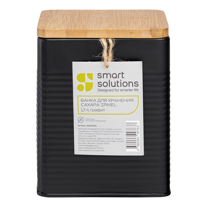 Банка для хранения сахара Irmel от бренда Smart Solutions станет прекрасным дополнением современного кухонного интерьера. Ее дизайн органично вписывается в различные стилевые решения: минимализм, лофт, фьюжн, эклектика, афро, сканди и другие.Особенности и преимущества:- Использование в изготовлении углеродистой стали гарантирует емкости отличные эксплуатационные характеристики – устойчивость к повреждениям, износу и простой уход. - Порошковое покрытие защищает металлическую поверхность от коррозии и обеспечивает изделию дополнительную прочность. - Крышка из бамбука с силиконовым уплотнителем плотно прилегает, исключая попадание внутрь банки пыли и влаги.Материалы: углеродистая сталь, бамбук, силикон. Размеры: 11,3x11,3x13,7 см. Объем: 1,7 л. Цвет: графит.Загрязнения рекомендуется удалять при помощи мягкого влажного материала. После очищения банку необходимо вытереть насухо. Запрещается мытье в посудомоечной машине, использование абразивов и агрессивной бытовой химии.