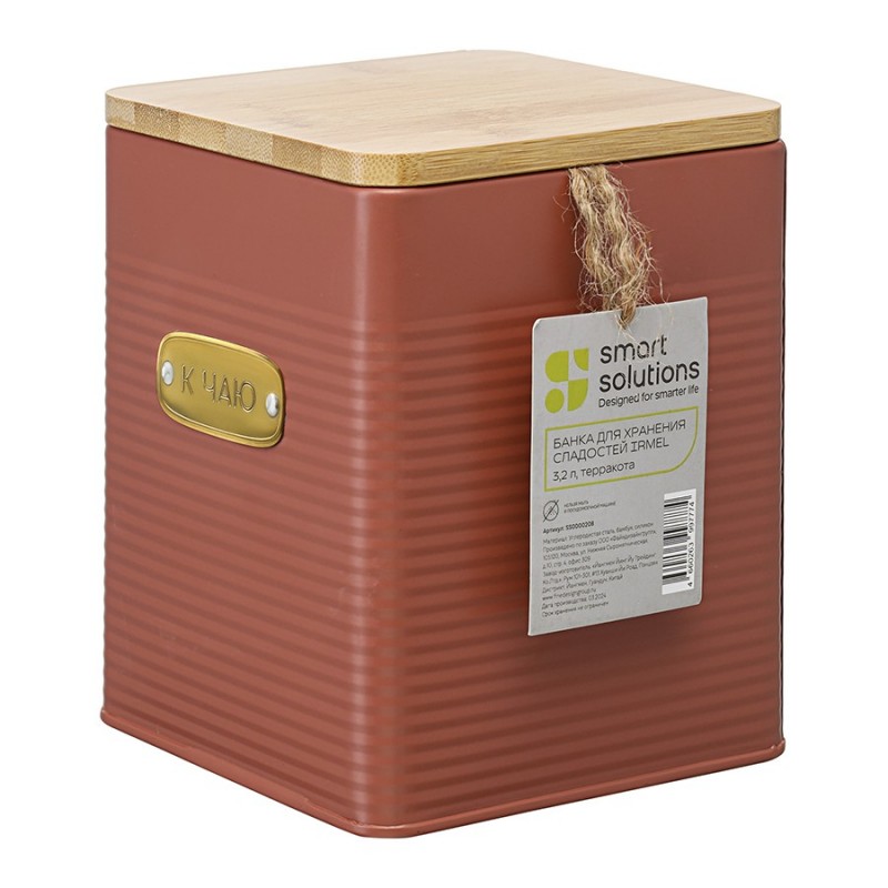 Банка для хранения сладостей Irmel от бренда Smart Solutions станет прекрасным дополнением современного кухонного интерьера. Ее дизайн органично вписывается в различные стилевые решения: минимализм, лофт, фьюжн, эклектика, афро, сканди и другие.Особенности и преимущества:- Использование в изготовлении углеродистой стали увеличенной толщины гарантирует емкости отличные эксплуатационные характеристики – устойчивость к повреждениям, износу и простой уход. - Порошковое покрытие защищает металлическую поверхность от коррозии и обеспечивает изделию дополнительную прочность. - Крышка из бамбука имеет увеличенную толщину и силиконовый уплотнитель, благодаря чему плотно прилегает, исключая попадание внутрь банки пыли и влаги.Материалы: углеродистая сталь, бамбук, силикон. Размеры: 14x14x17,2 см. Объем: 3,2 л. Цвет: терракота.Загрязнения рекомендуется удалять при помощи мягкого влажного материала. После очищения банку необходимо вытереть насухо. Запрещается мытье в посудомоечной машине, использование абразивов и агрессивной бытовой химии.