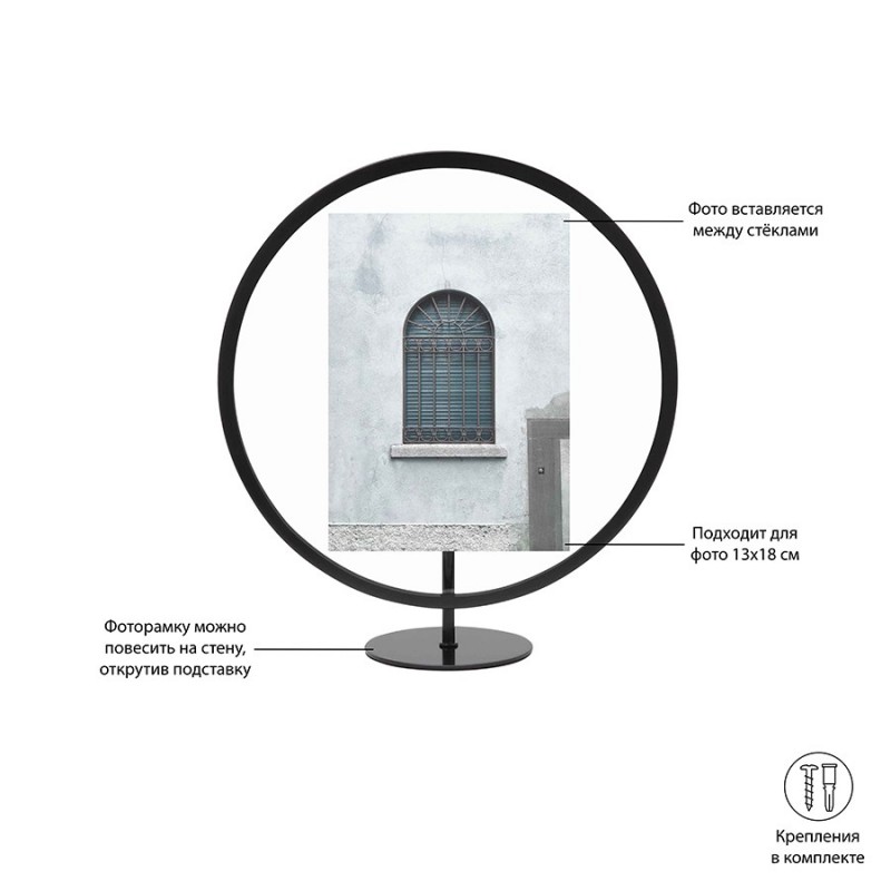 Фоторамка Infinity – привлекательный аксессуар, который станет оригинальным дополнением в интерьере спальни, гостиной, кабинета или детской комнаты.Конструкция изделия позволяет размещать фотографию между двух стеклянных панелей, тем самым защищая ее загрязнения и выгорания. Корпус круглой формы выполнен из качественного металла, стойкого к коррозии и ультрафиолетовым лучам. Фоторамку можно прикрепить к стене или поставить на стол, полку или комод.Материал: сталь, стекло, АБС-пластик. Размеры: 26х10х30 см. Цвет: черный.Пыль и загрязнения удалять при помощи мягкой влажной салфетки. Запрещается использование агрессивной бытовой химии и абразивных материалов.