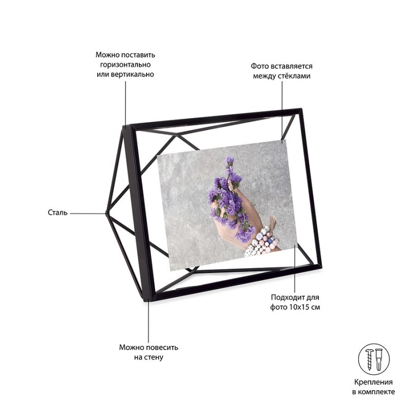 Фоторамка Prisma станет настоящим алмазом в интерьере вашей комнаты. Форма, вдохновленная огранкой бриллиантов, привлекает внимание и вызывает восхищение. При этом ее достоинство в том, что она не отвлекает от главного – от памятного снимка внутри.Подходит для фото размером 10х15 см.Материал: сталь, стекло, ПВХ. Размеры: 20х7х15 см. Цвет: черный.Пыль и загрязнения удалять при помощи мягкой влажной салфетки. Запрещается использование агрессивной бытовой химии и абразивных материалов.