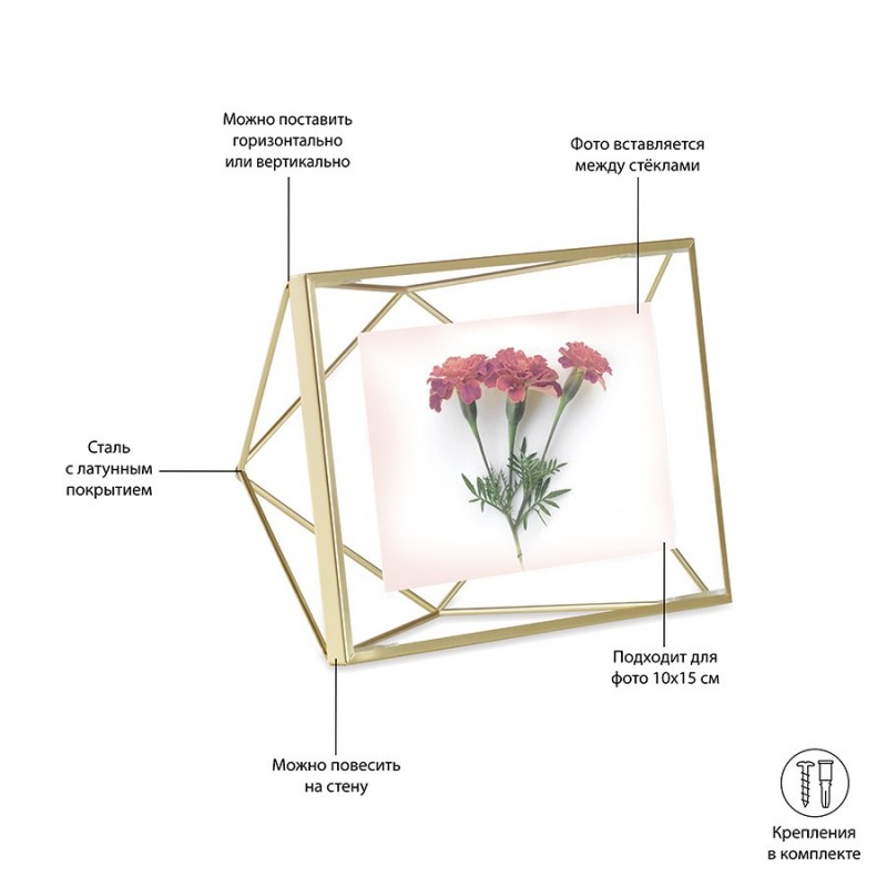 Фоторамка Prisma станет настоящим алмазом в интерьере вашей комнаты. Форма, вдохновленная огранкой бриллиантов, привлекает внимание и вызывает восхищение. При этом ее достоинство в том, что она не отвлекает от главного – от памятного снимка внутри.Подходит для фото размером 10х15 см.Материал: сталь, стекло, ПВХ. Размеры: 20х7х15 см. Цвет: золотистый.Пыль и загрязнения удалять при помощи мягкой влажной салфетки. Запрещается использование агрессивной бытовой химии и абразивных материалов.