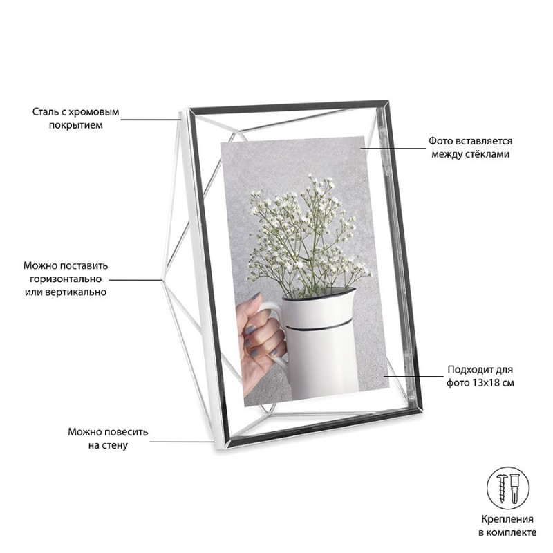 Фоторамка Prisma станет настоящим алмазом в интерьере вашей комнаты. Форма, вдохновленная огранкой бриллиантов, привлекает внимание и вызывает восхищение. При этом ее достоинство в том, что она не отвлекает от главного – от памятного снимка внутри.Подходит для фото размером 13х18 см.Материал: сталь, стекло, ПВХ. Размеры: 18х7х23 см. Цвет: хром.Пыль и загрязнения удалять при помощи мягкой влажной салфетки. Запрещается использование агрессивной бытовой химии и абразивных материалов.