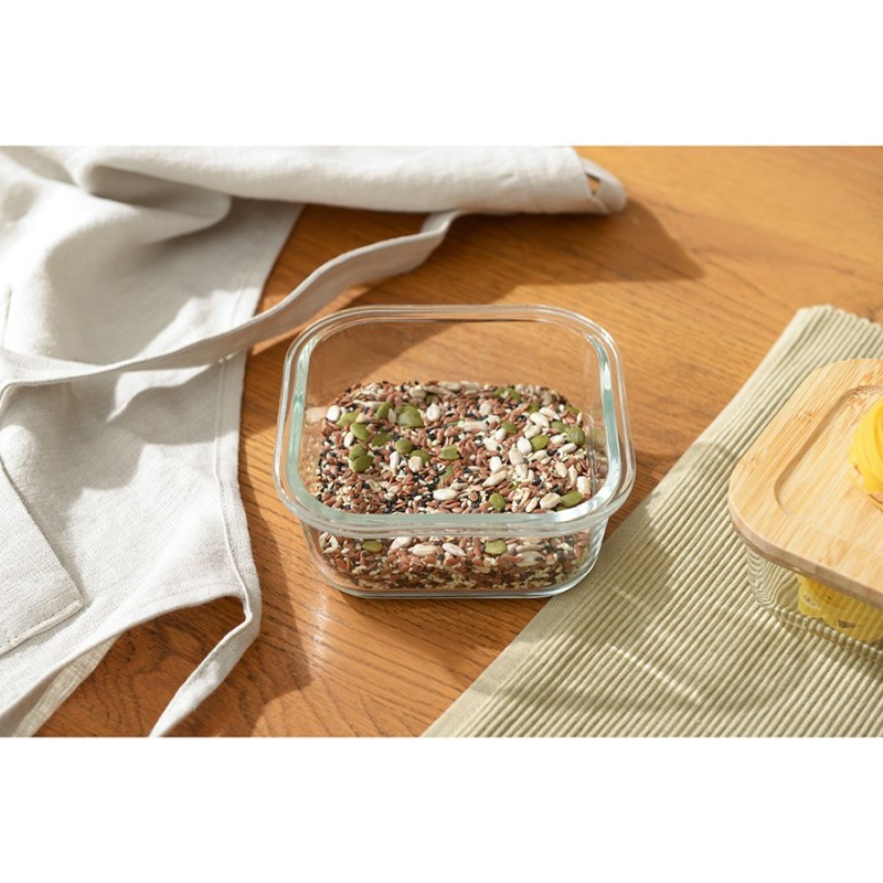 Контейнер с бамбуковой крышкой от бренда Smart Solutions идеально подойдет для хранения продуктов и готовой еды, а также для запекания блюд в духовке.Особенности и преимущества:- Контейнер из боросиликатного стекла устойчив к температурным перепадам, механическим повреждениям, легко очищается после использования. - Материал является безопасным для здоровья, не вступает в реакцию с продуктами, не содержит вредных соединений, в том числе Бисфенола-А. - Крышка из натурального бамбука с силиконовой вставкой обеспечивает плотное закрывание.Материалы: боросиликатное стекло, бамбук, силикон. Объем: 520 мл.Можно мыть в посудомоечной машине, замораживать, использовать в микроволновой печи и духовке при температуре до 560? без крышки. Крышку рекомендуется протирать влажной тканью. Запрещается применение абразивных материалов и агрессивной бытовой химии.