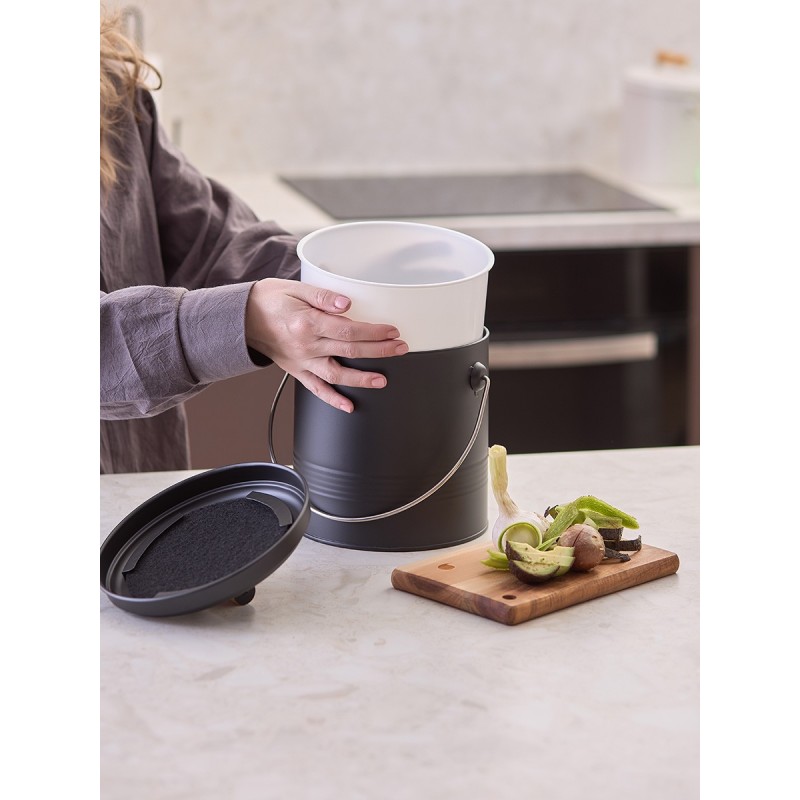 Контейнер для пищевых отходов Irmel – стильное и практичное решение для всех, кто стремится к более экологичному и осознанному образу жизни. С ним вы сможете легко и удобно сортировать мусор, сохраняя чистоту и порядок на кухне.Особенности и преимущества:- Использование в изготовлении углеродистой стали увеличенной толщины гарантирует контейнеру отличные эксплуатационные характеристики – устойчивость к повреждениям, износу и простой уход. - Порошковое покрытие защищает металлическую поверхность от коррозии и обеспечивает изделию дополнительную прочность. - В крышке предусмотрен специальный угольный фильтр, который поглощает неприятные запахи. - Внутренний пластиковый контейнер легко вынимается и очищается от загрязнений, что делает процесс утилизации отходов максимально удобным.Материалы: углеродистая сталь. Размеры: 18x18х23 см. Объем: 3,5 л. Цвет: графит.Металлический контейнер можно очищать при помощи мягкого влажного материала, после чего сразу вытирать насухо. Контейнер из пластика можно мыть вручную в теплой мыльной воде. Запрещается использование абразивов и агрессивной бытовой химии.