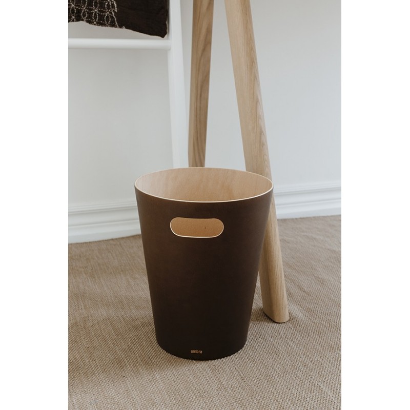 Минималистичная корзина для мусора Woodrow сделает любое пространство более стильным, функциональным и поможет в поддержании порядка в комнате или на рабочем месте. Корзина имеет удобную ручку для переноски и двухцветный дизайн. Выполненная из натуральной древесины бука и тополя, она прекрасно смотрится в интерьере дома и офиса. Экологичные материалы обеспечивают безопасную эксплуатацию.Материал: бук, тополь. Объем: 7,5 л. Размеры: диаметр верха – 22,9 см; диаметр низа – 16,3 см; высота – 27,9 см. Цвет: эспрессо. Дизайн: Henry Huang.