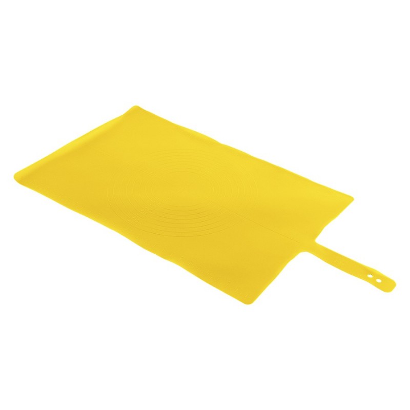 Коврик Foss защитит стол от загрязнений во время замешивания теста. Изделие выполнено из пищевого силикона – экологичного материала, который не имеет запаха и легко очищается после использования. Аксессуар не скользит по рабочей поверхности, а также позволяет не добавлять масло и муку для предотвращения прилипания густой массы. Наличие разметки помогает получить пласт теста идеальной формы и размера. Для компактного хранения коврик легко сворачивается и надежно закрепляется в собранном виде специальным фиксирующим ремешком.Материал: силикон. Размеры: 37,7х57,4 см. Цвет: желтый.Можно использовать в микроволновой печи и мыть в посудомоечной машине.