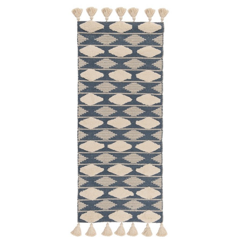 Ковер из хлопка синего цвета Argyle из коллекции Ethnic украшен контрастным геометрическим принтом и пышными кисточками по бокам. Модель органично впишется в скандинавский стиль или минимализм. Ковер можно повесить на стену в качестве арт-объекта, поместить на пол возле дивана или кровати. Изделие на подкладке, выполнено из прочного высококачественного хлопка, край с изнаночной стороны укреплен киперной лентой, исключающей деформацию. Ковер представлен в нескольких размерах. Размеры изделия указаны без учета бахромы и декоративных элементов. Фактические размеры ковра могут незначительно отличаться в пределах 3-5 см.Размер: 70х160 см. Плотность: 2450 г/м2. Высота ворса: 10 мм.! Стирка запрещена ! Не отбеливать ! Гладить запрещено ! Сухая чистка запрещена ! Барабанная сушка запрещена ! Допускается ручная чистка пятенОбращаем ваше внимание, что представленный ковер изготавливается мастерами вручную с большой заботой и теплотой. Все изделия уникальны. Соответственно, неполное совпадение рисунка, заявленного на фото, а также возможное расхождение в размерах в пределах 10-15 см допустимы и не являются браком.Засохшие пятна можно удалять соскабливанием мягкими щетками в направлении к центру пятна, а влажные — бумажными салфетками или тканью с мягким моющим средством. Для чистки ковра пылесосом используйте стандартную щетку. Применение турбощетки категорически запрещается. Перед эксплуатацией изделия обязательно ознакомьтесь с правилами ухода на этикетке.Этот экологичный ковер выполнен из переработанного материала, поэтому каждое изделие имеет неповторимый вид. Небольшая разница в цвете и фактуре текстиля в разных частях ковра делает его уникальным и особенным. После того, как Вы достали новый ковер из упаковки, он может лежать не совсем ровно, но выпрямится через несколько недель.Ковер может выцветать под воздействием прямых солнечных лучей. Рекомендуем периодически менять расположение изделия, чтобы цвет менялся равномерно. В первые недели использования возможно небольшое осыпание ворса и появление петелек на полотне ковра. Это абсолютно нормально и пройдет со временем. Запрещается складывать ковер пополам. Сверните ковер в рулон лицевой стороной внутрь. Ковры темных оттенков могут оставлять следы на светлых поверхностях, особенно при намокании, поэтому рекомендуем использовать подложку, чтобы защитить напольное покрытие.