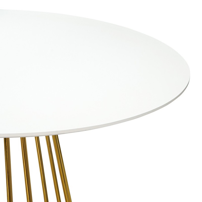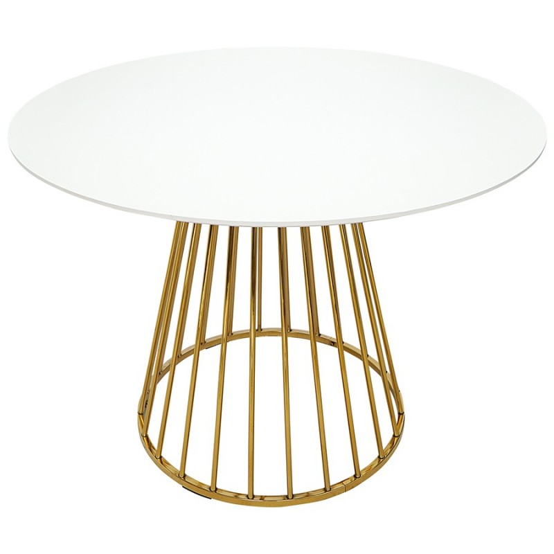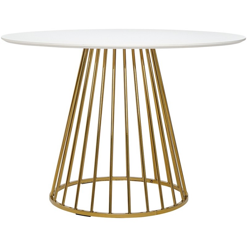 Обеденный стол Tyra – яркий пример удачного сочетания стильного дизайна и практичности. В пространствах в стиле лофт, сканди и минимализм этот предмет мебели поможет сделать акцент на простой и функциональной обстановке, а классическому интерьеру придаст новое звучание.Особенности и преимущества:- Столешница из прочной и устойчивой к износу МДФ не требует сложного ухода и долго сохраняет привлекательный вид. - Конусовидное основание из высокопрочной хромированной стали делает дизайн интересным, обеспечивает конструкции стабильность, надежность и долговечность. - Сочетание элегантности и практичности дает возможность использовать модель не только в домашних условиях, но и для обустройства коммерческих помещений. - Стол с круглой столешницей позволяет комфортно разместить большее количество человек, при этом не занимает много места.Материалы: сталь, МДФ. Размеры: 110х110х75 см. Диаметр основания: 65 см. Цвет: белый/золотой.Пыль и загрязнения с поверхностей можно удалять при помощи мягкого влажного материала. Сразу после очищения мебель рекомендуется протереть сухой тканью. Запрещается применение жестких щеток, абразивов и агрессивной бытовой химии.