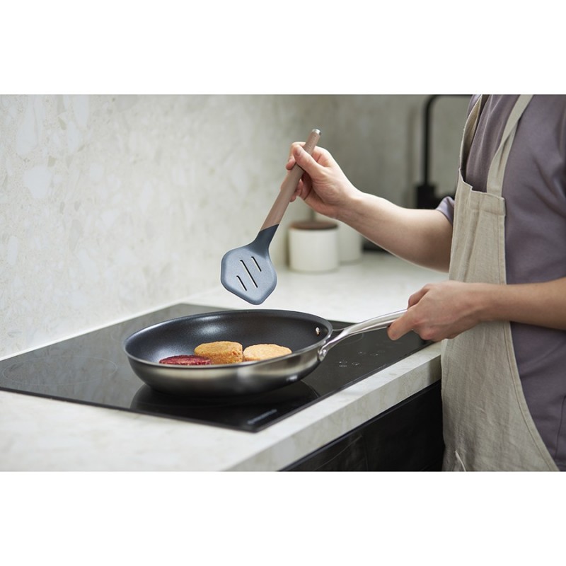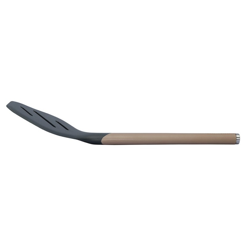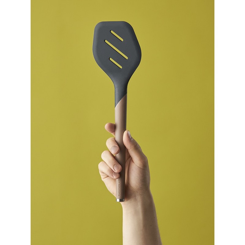 Лопатка с прорезями SmartChef от дизайнерского бренда Smart Solutions – стильный и практичный кухонный аксессуар для ежедневного использования, который идеально подойдет для переворачивания и распределения продуктов во время готовки.Особенности и преимущества:- Сочетание нейлона и силикона создает идеальный баланс жесткости и гибкости, что делает кухонный аксессуар удобным в использовании. - Рабочая часть из силикона не царапает посуду, имеет специальный изгиб и заостренный край для быстрого и легкого подхватывания продуктов. - Специальные отверстия не только позволяют стечь маслу, но и уменьшают площадь соприкосновения лопатки с раскаленной поверхностью сковороды. - Ручка с мягким, нескользящим покрытием софт-тач обеспечивает надежный захват и тактильный комфорт. - Металлический наконечник дает возможность подвешивать инструмент на магнитный держатель для компактного хранения.Коллекция кухонных инструментов SmartChef объединяет в себе лаконичный дизайн, высокую функциональность и инновационные материалы, чтобы приготовление блюд доставляло удовольствие, а пространство кухни выглядело стильным и организованным. Поверхности софт-тач дарят приятные тактильные ощущения и улучшают эргономику продуктов, делая их более удобными в использовании. Главное – все предметы специально разработаны для использования с посудой, имеющей антипригарное покрытие.Материалы: нейлон, силикон, сталь. Размеры: 9х1,7х32 см. Ширина рабочей части: 9 см. Толщина рабочей части: 0,5 см. Ширина ручки: 2,5 см. Цвет: капучино-графит.Лопатку можно мыть вручную и в посудомоечной машине.