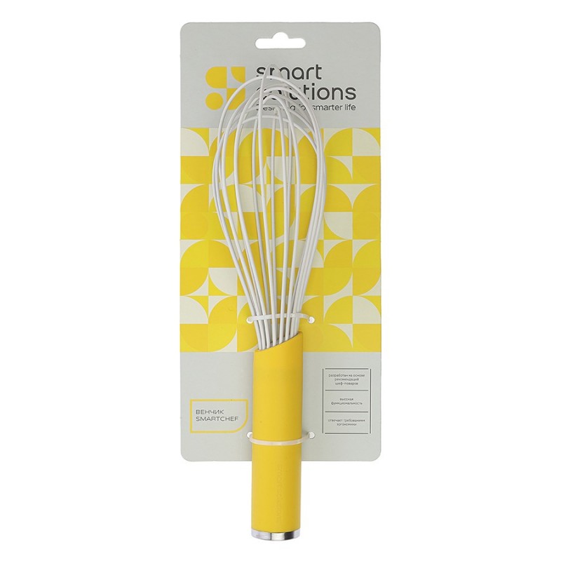 Венчик SmartChef от дизайнерского бренда Smart Solutions – стильный и удобный в использовании кухонный аксессуар, который станет незаменимым помощником при замешивании теста, приготовлении крема для выпечки и различных соусов.Особенности и преимущества:- Рабочие элементы из стали имеют силиконовую оплетку, что создает идеальный баланс жесткости и гибкости для качественного смешивания и взбивания. - Петли с мягким покрытием не царапают посуду, благодаря чему такой венчик идеально подходит для емкостей из хрупких материалов. - Ручка с мягкой, нескользящей поверхностью софт-тач обеспечивает удобный захват и тактильный комфорт. - Наличие специального металлического наконечника дает возможность подвешивать инструмент на магнитный держатель для компактного хранения.Коллекция кухонных инструментов SmartChef объединяет в себе лаконичный дизайн, высокую функциональность и инновационные материалы, чтобы приготовление блюд доставляло удовольствие, а пространство кухни выглядело стильным и организованным. Поверхности софт-тач дарят приятные тактильные ощущения и улучшают эргономику продуктов, делая их более удобными в использовании. Главное – все предметы специально разработаны для использования с посудой, имеющей антипригарное покрытие.Материалы: нейлон, силикон, сталь. Размеры: 7х7х27,5 см. Цвет: желтый.Венчик рекомендуется мыть вручную.