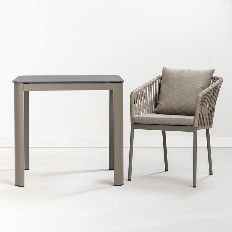 Стол обеденный Leif – прекрасный вариант для обустройства уютного пространства в зоне отдыха и приема пищи. Вы можете использовать этот предмет мебели не только в помещении, но и на открытой террасе или в саду, не беспокоясь о том, что он будет поврежден дождем, солнцем или влагой.Особенности и преимущества:- Покрытие голландской фирмы AkzoNobel, лидера в производстве покрытий для металлических изделий, обеспечивает мебели высокую износостойкость и возможность использования в уличных условиях. - Стол имеет прочный каркас из алюминиевой трубы толщиной 1,2 мм и 1,5 мм. - Круговая полная сварка по всей поверхности соприкосновения шва гарантирует конструкции надежность и долговечность. - Столешница из ударопрочного закаленного стекла толщиной 5 мм легко моется и долго сохраняет привлекательный вид. - Одна сторона столешницы шершавая, покрытая каменной крошкой для большей прочности, а вторая - гладкая. - Стол выдерживает нагрузку до 60 кг. - Гарантия на мебель – 12 месяцев.Материал: алюминий, закаленное кварцевое стекло. Размеры: 80х80х75 см. Расстояние между ножками: 76 см. Цвет: серо-бежевый.Столешницу рекомендуется протирать влажной тканью без длинных волокон – это поможет избежать оседания пыли и частиц текстиля. Запрещается применение абразивов и агрессивной бытовой химии.