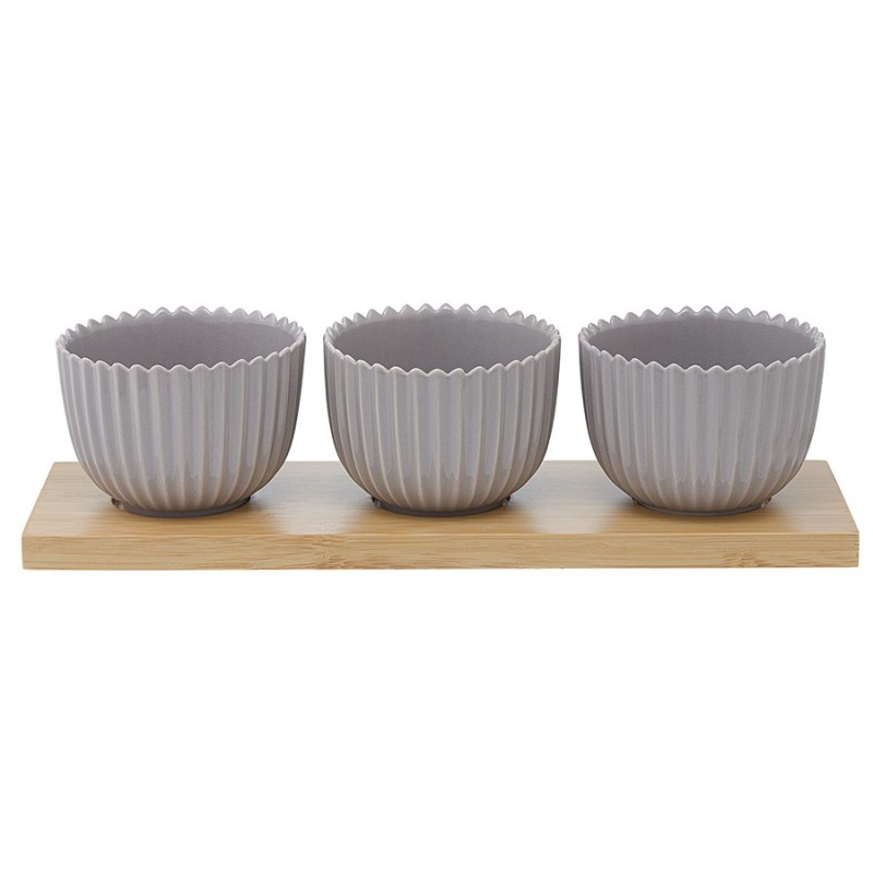 Набор для сервировки состоит из трех фарфоровых чаш насыщенного темно-серого цвета и подставки из полированного бамбука. Такой набор идеально подойдет для подачи закусок, соусов или сладостей к праздничному столу или семейному ужину. Глянцевая фарфоровая поверхность чаш имеет рифленую фактуру, что добавляет сервировке легкости и утонченности. При этом чаши очень практичны: не царапаются, не меняют цвет и легко моются. Этот набор прекрасно сочетается с другой посудой из коллекции Edge, в которой есть тарелки, чашки, салатники, сахарницы и другие предметы.Материал: фарфор, бамбук. Размеры чаши: 8х8х6 см. Размеры подставки: 9х28х1,5 см. Объем чаши: 150 мл.• Можно использовать в микроволновой печи • Можно мыть в посудомоечной машине • Можно использовать в духовке при температуре не более 180° C • Можно замораживать