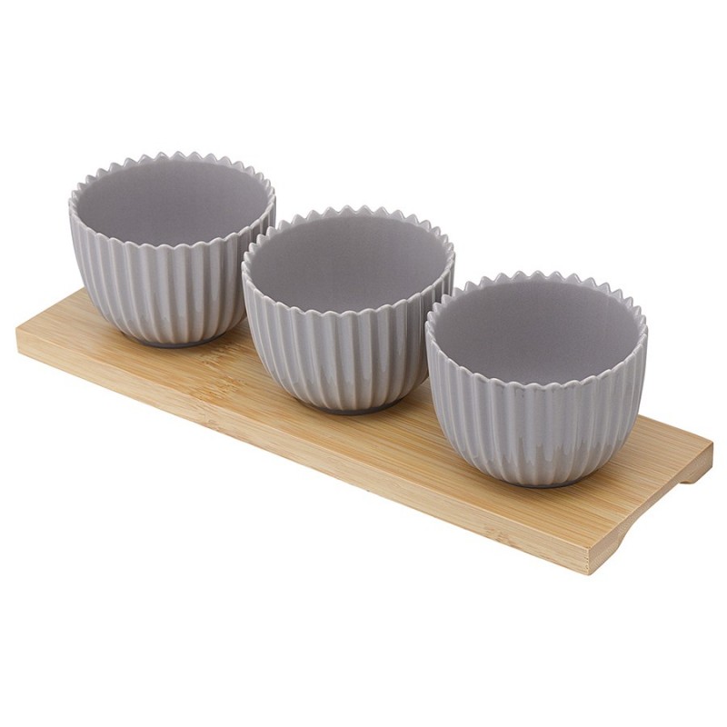 Набор для сервировки состоит из трех фарфоровых чаш насыщенного темно-серого цвета и подставки из полированного бамбука. Такой набор идеально подойдет для подачи закусок, соусов или сладостей к праздничному столу или семейному ужину. Глянцевая фарфоровая поверхность чаш имеет рифленую фактуру, что добавляет сервировке легкости и утонченности. При этом чаши очень практичны: не царапаются, не меняют цвет и легко моются. Этот набор прекрасно сочетается с другой посудой из коллекции Edge, в которой есть тарелки, чашки, салатники, сахарницы и другие предметы.Материал: фарфор, бамбук. Размеры чаши: 8х8х6 см. Размеры подставки: 9х28х1,5 см. Объем чаши: 150 мл.• Можно использовать в микроволновой печи • Можно мыть в посудомоечной машине • Можно использовать в духовке при температуре не более 180° C • Можно замораживать