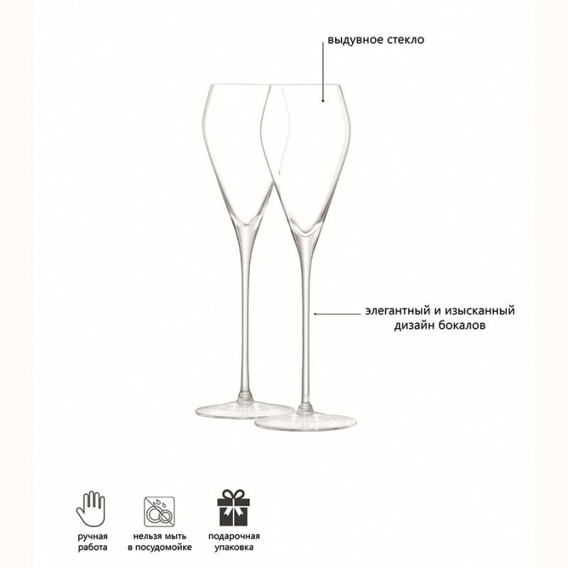 Бокалы для Просекко Wine созданы, чтобы каждый раз наслаждаться всеми гранями вкуса и аромата любимого напитка. Их тонкие стенки красиво отражают свет и позволяют наблюдать за долгой игрой пузырьков, создавая поистине эстетическое наслаждение для глаз.Особенности и преимущества:- Бокалы из выдувного стекла отличаются прочностью, высокой прозрачностью, не имеют производственных швов, благодаря чему выглядят эстетично и изысканно. - Вытянутая чаша позволяет пить вино не спеша, наслаждаясь не только его вкусом, но и видом поднимающихся на поверхность пузырьков. - Удлиненная ножка создает изысканный, утонченный силуэт и не дает шампанскому нагреваться от руки.Wine – коллекция классических бокалов и предметов сервировки, созданная, чтобы получать истинное удовольствие от любимых напитков.Важно! Поскольку изделия изготавливаются вручную, их размеры могут незначительно отличаться и допускается наличие пузырьков в толще стекла: круглые < 3 мм, овальные < 5 мм и их небольшие скопления в виде пены. Также возможно наличие прожилок (видимых нитей) на стекле менее 50% длины окружности любого предмета. Все это не брак, а допустимые индивидуальные особенности товаров, произведенных ручным способом.Материал: выдувное стекло. Объем: 250 мл. Высота: 26 см. Ширина: 7 см. Количество в наборе: 2 шт.Бокалы рекомендуется мыть вручную в теплой мыльной воде, после чего протирать сухой мягкой тканью.