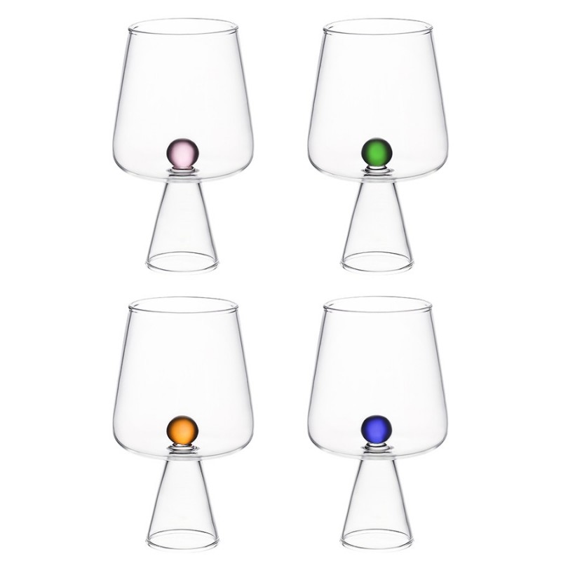 Бокалы для вина Orb – прекрасный способ сделать сервировку особенной. Дизайн с яркими акцентами в виде цветных шариков привлекает внимание и эффектно выделяет предметы из данной коллекции на фоне других.Особенности и преимущества:- Боросиликатное стекло, из которого выполнены бокалы, обладает повышенной прочностью и термостойкостью. - Материал легко очищается от загрязнений и не содержит в своем составе вредных соединений. - Декор в виде цветных шариков делает дизайн уникальным и узнаваемым.Материал: боросиликатное стекло. Диаметр верха: 7,1 см. Диаметр середины: 9 см. Диаметр низа: 4,7 см. Высота: 15,7 см. Высота ножки: 6 см. Вес: 520 г. Толщина стенки: 0,2 см. Объем: 400 мл. Цвет: разноцветный. Количество бокалов в наборе: 4 шт.Бокалы рекомендуется мыть вручную в теплой мыльной воде с помощью мягкой губки. Запрещается использование абразивных материалов и агрессивной бытовой химии.
