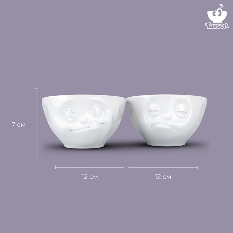 Оригинальные чаши с забавными рожицами отлично подойдут для подачи закусок, супов, десертов.Чаши выполнены из высококачественного фарфора. Поставляются в красивой подарочной коробке.Размеры одной чаши: 7х11,6х12 смДиаметр: 11,6 смМожно мыть в посудомоечной машине и ставить в микроволновую печь.