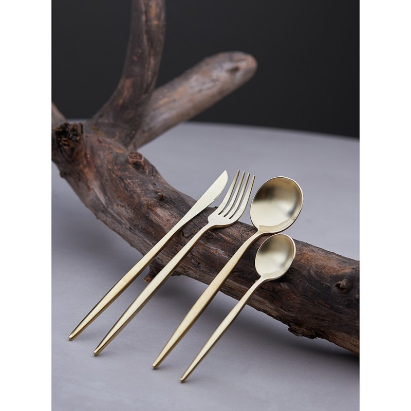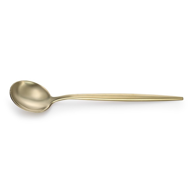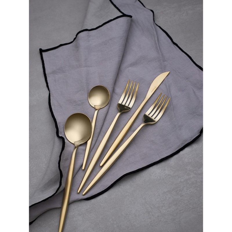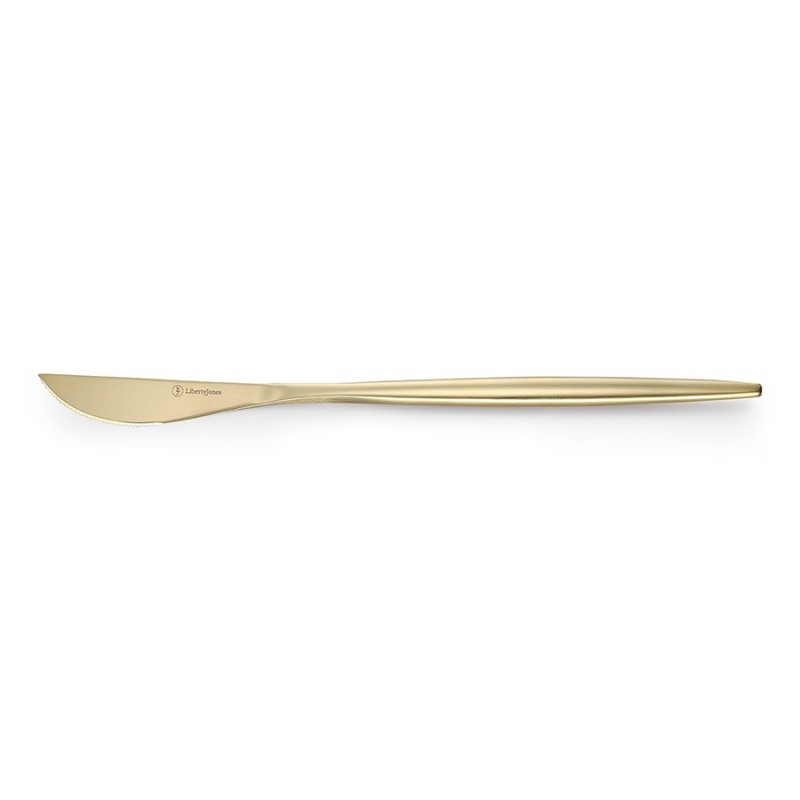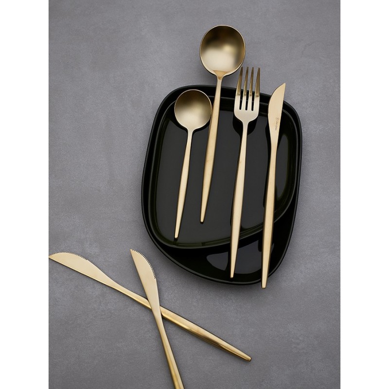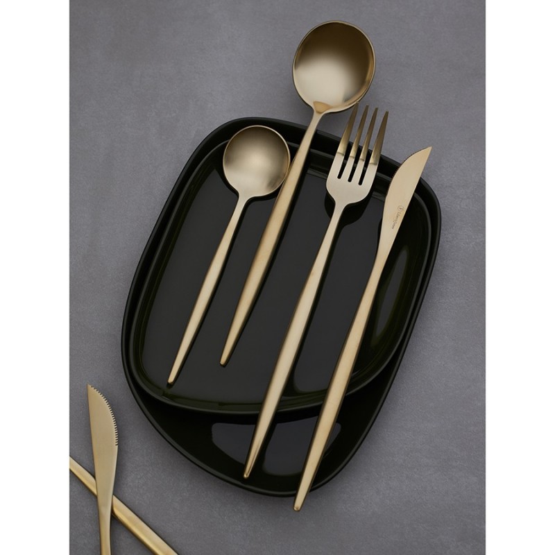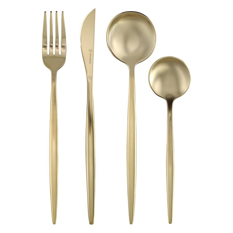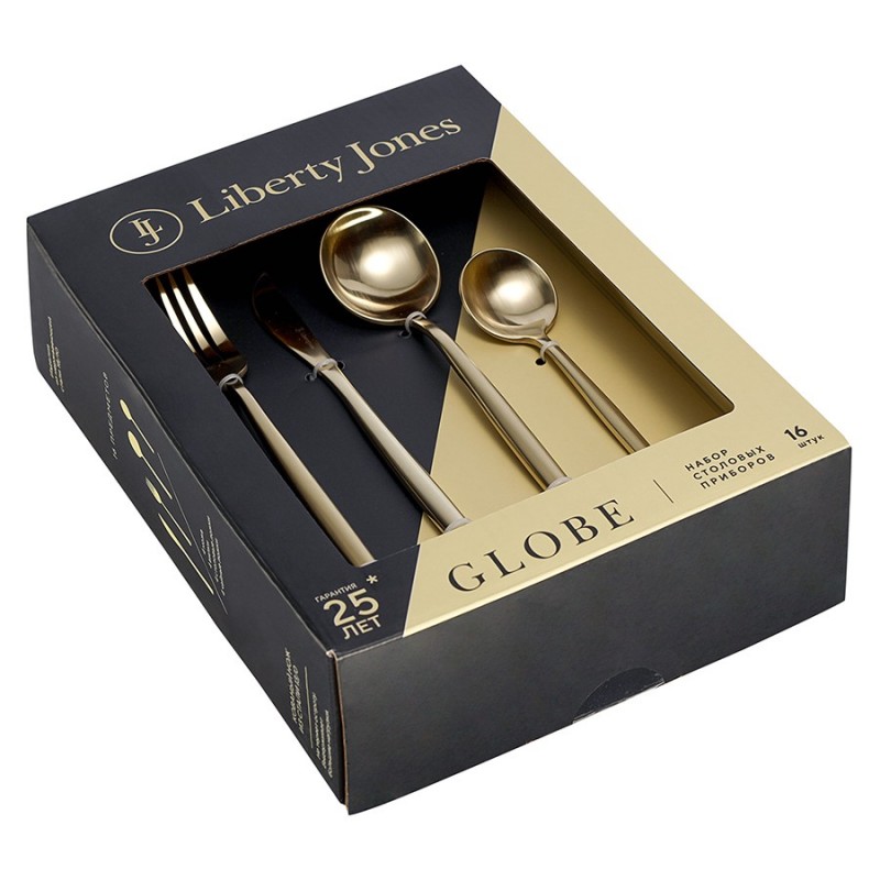 Столовые приборы Globe от дизайнерского бренда Liberty Jones сделают любую сервировку более стильной и утонченной, а каждый прием пищи – особенным. Набор состоит из 16 предметов и включает все необходимое для обслуживания 4-х человек.Особенности и преимущества:- Изделия из высококачественной нержавеющей стали 18/10 отличаются долговечностью и стойкостью к коррозии. - Лезвия ножей изготовлены из нержавеющей стали 13/0, благодаря чему обладают устойчивостью к механическим повреждениям и долго остаются острыми. - Рабочая часть приборов имеет прочное и износостойкое титановое покрытие, которое при этом является самым безопасным. - Округлые формы придают приборам элегантный и в то же время интересный вид. - Аксессуары золотистого цвета привносят в сервировку нотки роскоши и благородства.Материалы: нержавеющая сталь 304 (18/10), нержавеющая сталь 13/0. Размеры: Нож: длина – 22,6 см; ширина – 1,5 см; толщина – 7 мм; вес – 61 г. Вилка: длина – 22,2 см; ширина – 2,6 см; толщина – 2 мм; вес – 69 г. Ложка: длина – 21,5 см; ширина – 4,9 см; толщина – 2 мм; вес – 84 г. Чайная ложка: длина – 15,9 см; ширина – 4 см; толщина – 2 мм; вес – 40 г. Цвет: золотистый матовый. Количество предметов в наборе: 16 шт.Приборы рекомендуется мыть вручную.