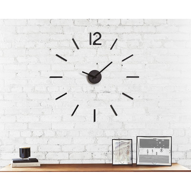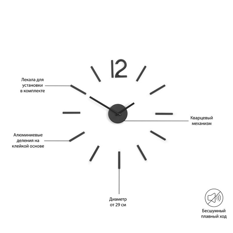 На создание этих часов дизайнеров вдохновила современная архитектура и минималистичные циферблаты модных наручных часов.Они необычны тем, что индикаторы и сам механизм крепятся к стене отдельно друг от друга: индикаторы на специальную липучку 3M Command, а механизм – на шурупы. Это дает простор для фантазии, так как часы могут быть любого диаметра. Шаблон для крепления часов входит в комплект. Индикаторы, цифра "12" и механизм со стрелками выполнены из литого алюминия. Ход часов плавный и совершенно бесшумный. Работают часы от одной стандартной батарейки типа АА (не входит в комплект).Материал: алюминий, сталь. Размеры: 100х4х100 см. Цвет: черный.Пыль и загрязнения удалять при помощи мягкой влажной салфетки. Запрещается использование агрессивной бытовой химии и абразивных материалов.