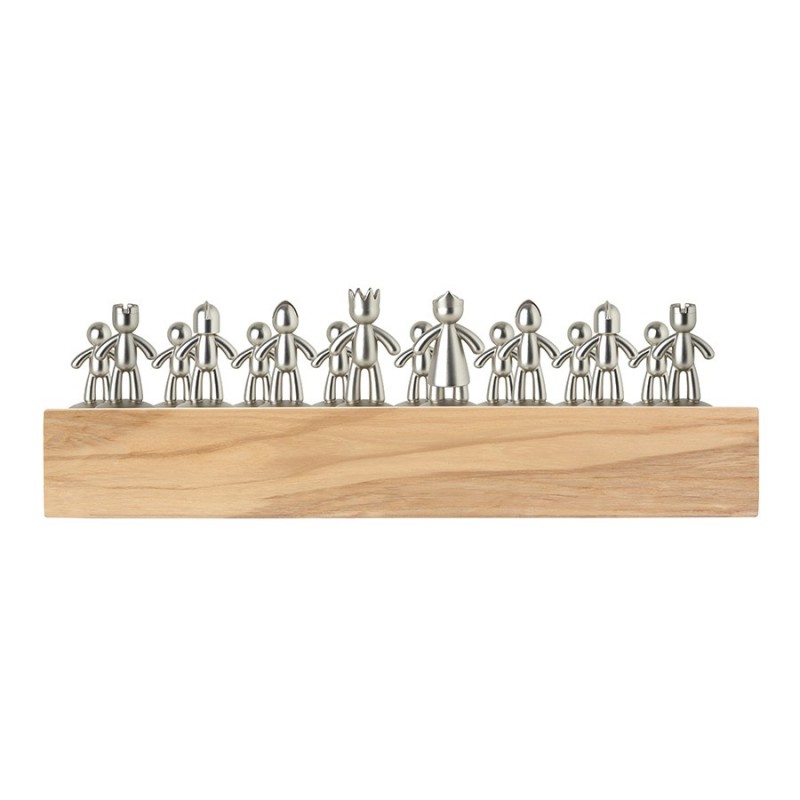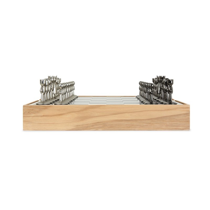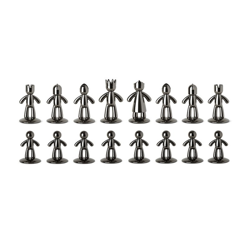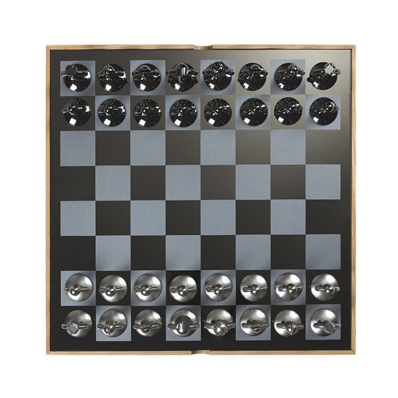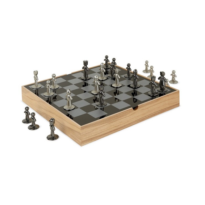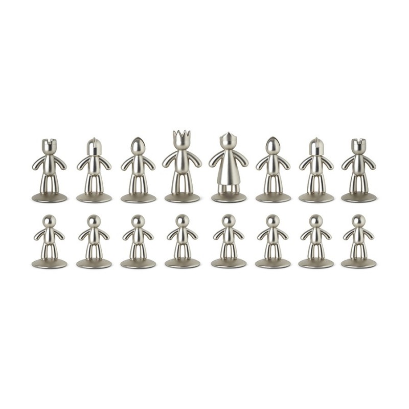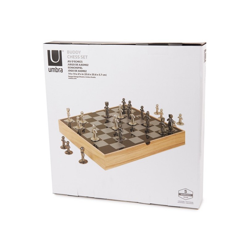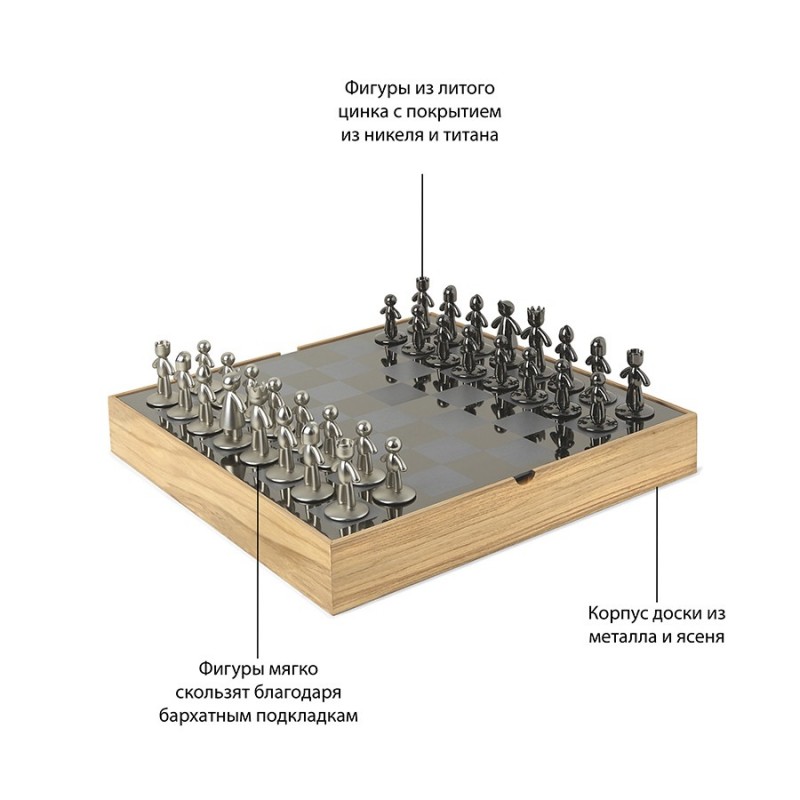 Набор из шахматной доски и необычных шахмат в виде культовых человечков Buddy станет отличным подарком и для заядлых шахматистов, и для тех, кто просто любит красивые необычные вещи.Шахматные фигуры выполенены из металла с никелевым и титановым покрытиями и бархатными накладками на основании, которые защищают поле от царпапин. Металлическое шахматное поле заключено в деревянную коробку из натурального ясеня, которая также служит местом для хранения шахматных фигур.