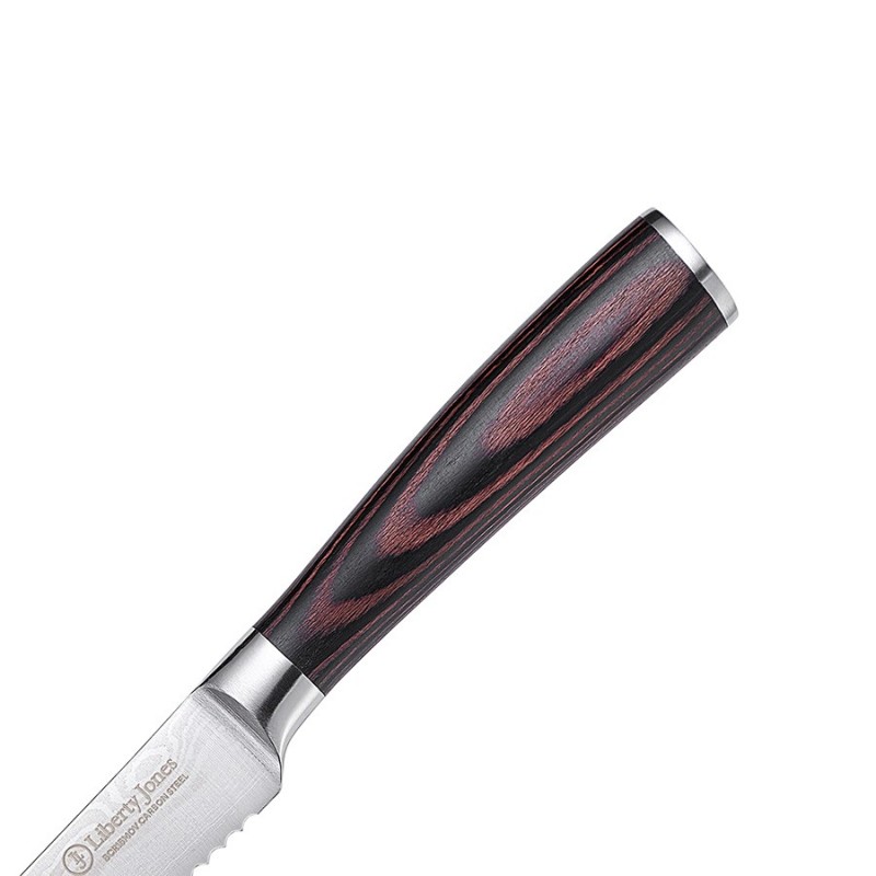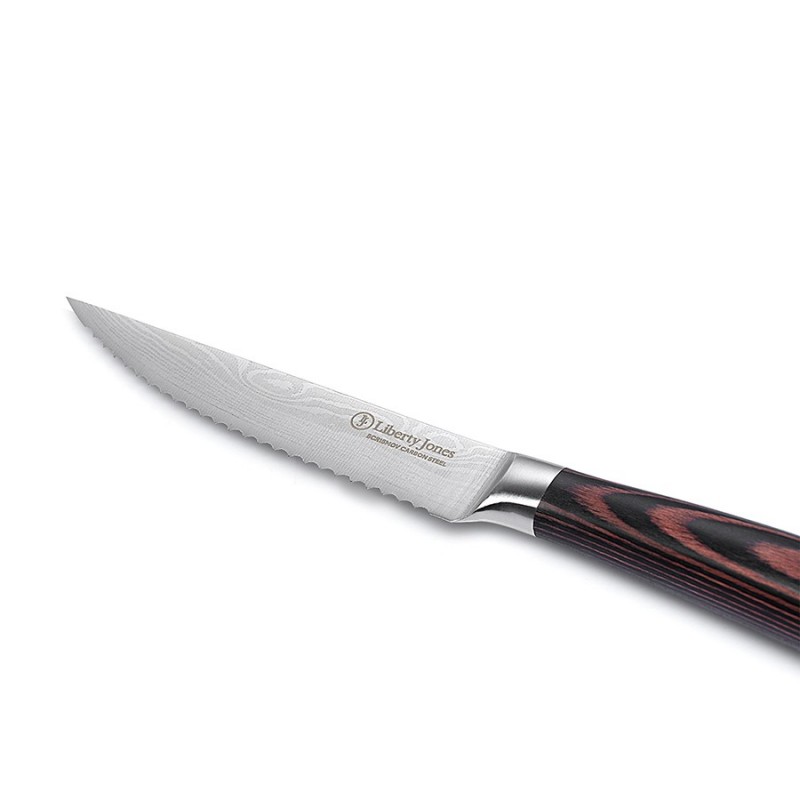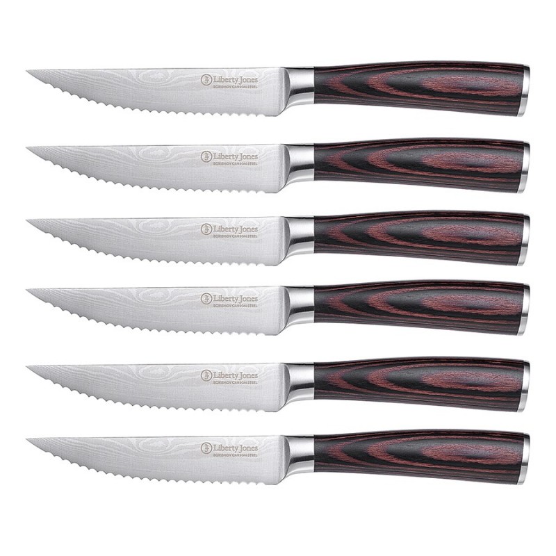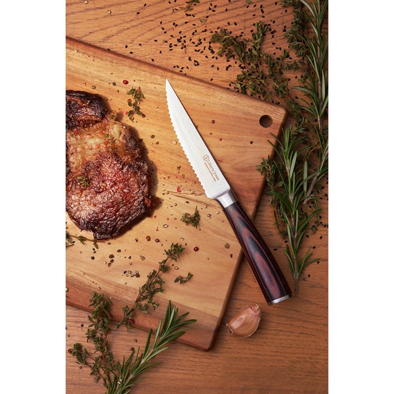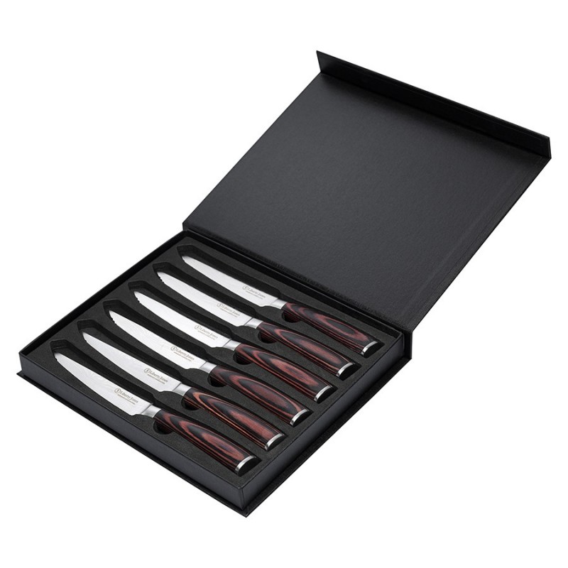Набор ножей для стейка Butcher должен быть на кухне каждого ценителя мясных блюд. Эти кухонные инструменты сочетают в себе стильный дизайн, высокую практичность и просто созданы для тех, кто понимает, что идеальный стейк начинается с правильной нарезки.Особенности и преимущества:- Лезвия из углеродистой стали характеризуются прочностью, устойчивостью к высоким нагрузкам, не требуют частой заточки. - Рукоятки ножей изготовлены из композита Pakka wood, который получают путем смешивания и последующего прессования под высоким давлением слоев древесного шпона со смолами и красителями. Процесс стабилизации обеспечивает готовому материалу высокую прочность, водонепроницаемость, устойчивость к механическом повреждениям и температурным воздействиям.Материалы: углеродистая сталь, Pakka wood. Размеры: 2,2х28,6х2 см. Толщина лезвия: 0,2 мм. Длина клинков: 11,4 см. Угол заточки: 15-17°. Количество в наборе: 6 шт.Ножи рекомендуется мыть вручную. Запрещается использование абразивных материалов и агрессивной бытовой химии.