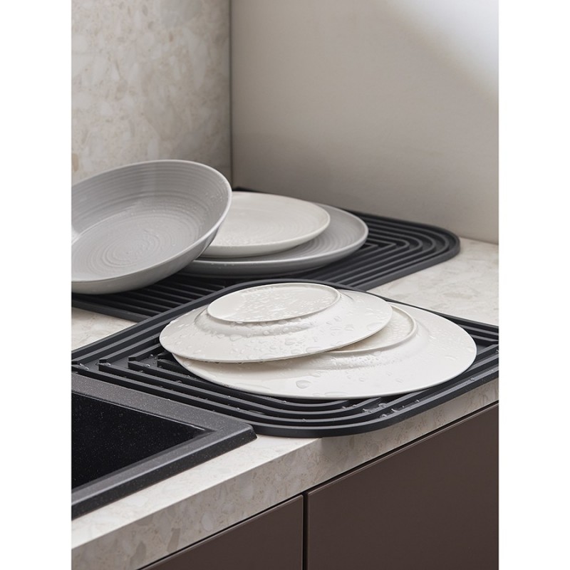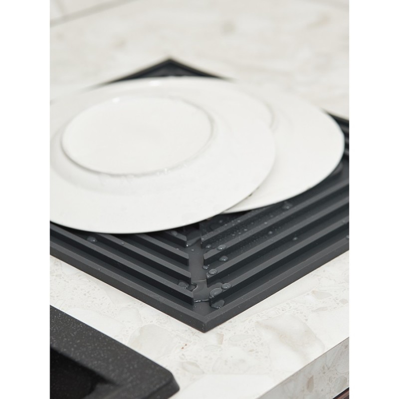 Коврик для сушки Dry Flex – отличное решение для любой кухни. Он намного компактнее металлических и пластиковых сушилок для посуды, благодаря этому занимает минимум места на столешнице.Особенности и преимущества:- Изготовлен из прочного, гибкого, устойчивого к повреждениям, износу и долговечного силикона. - Имеет специальную ребристую поверхность, которая уберегает посуду от падения, задерживает и позволяет легко слить стекающую воду. - Без труда очищается, дезинфицируется и удобно складывается для компактного хранения. - Не скользит по столешнице и позволяет бережно сушить хрупкие предметы сервировки. - Выполнен в нейтральном цвете, благодаря чему прекрасно вписывается в любой интерьер.Рекомендуем регулярно просушивать коврик. Для этого после сушки посуды его необходимо на некоторое время перевернуть лицевой стороной вниз, чтобы ушла вся влага из желобов.Материал: силикон. Размеры: 34,5х31,5 см. Цвет: темно-серый.Можно мыть вручную и в посудомоечной машине.