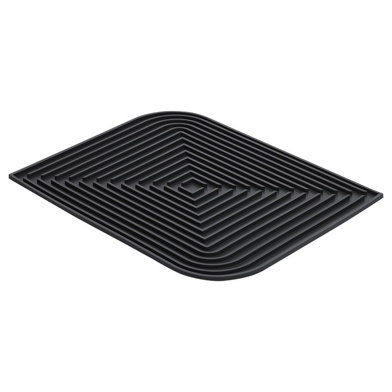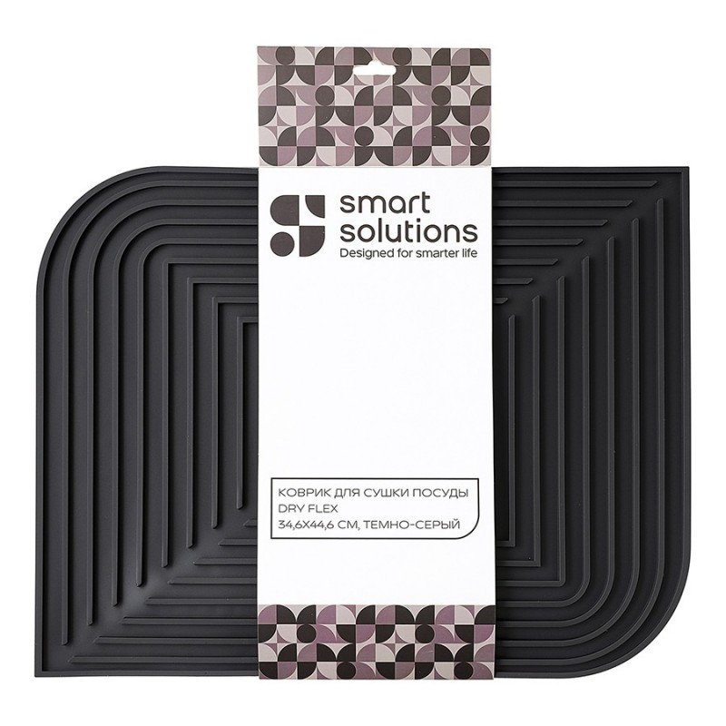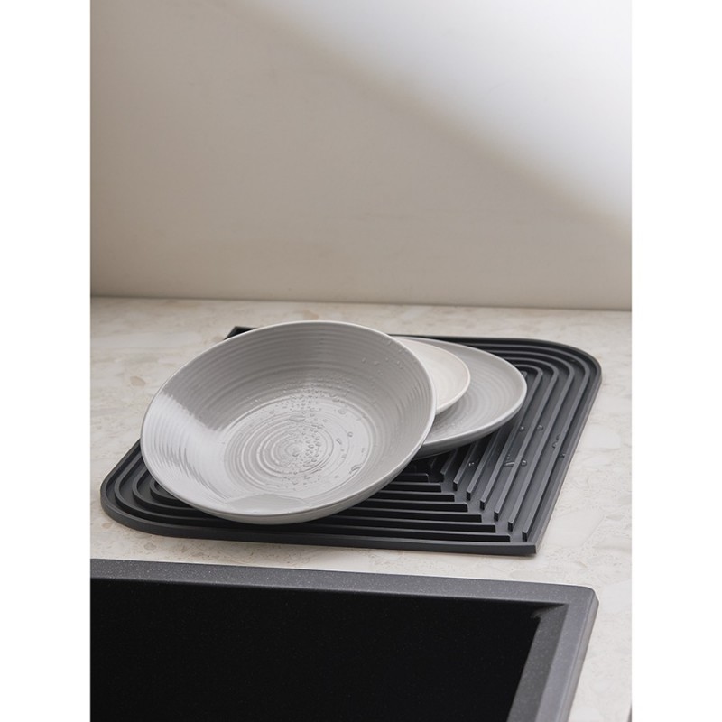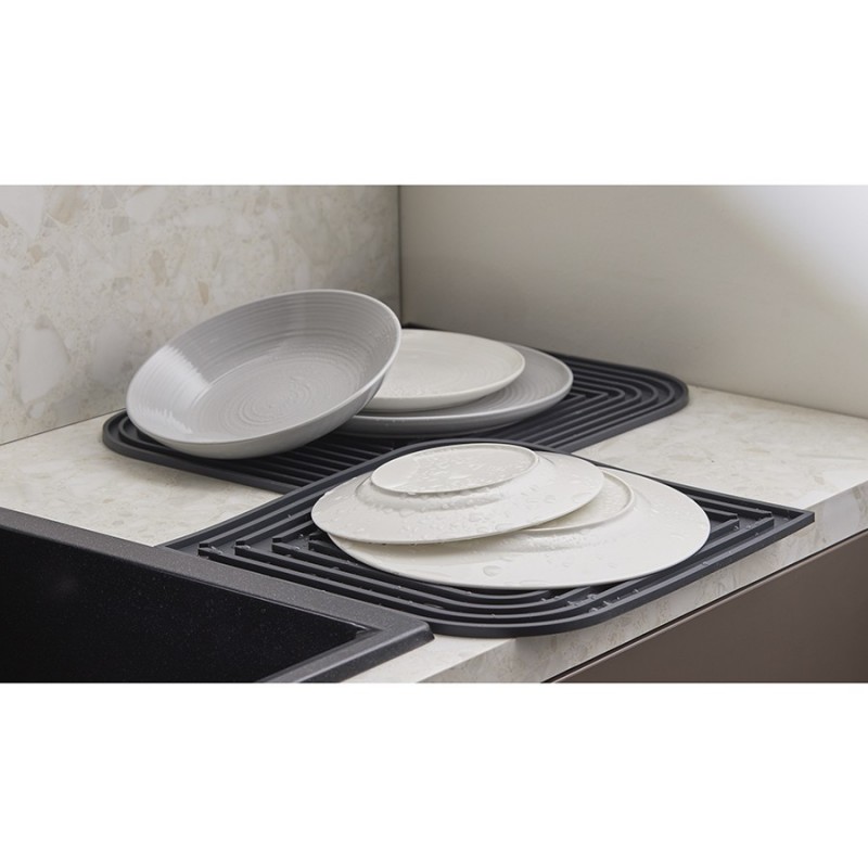 Коврик для сушки Dry Flex – отличное решение для любой кухни. Он намного компактнее металлических и пластиковых сушилок для посуды, благодаря этому занимает минимум места на столешнице.Особенности и преимущества:- Изготовлен из прочного, гибкого, устойчивого к повреждениям, износу и долговечного силикона. - Имеет специальную ребристую поверхность, которая уберегает посуду от падения, задерживает и позволяет легко слить стекающую воду. - Без труда очищается, дезинфицируется и удобно складывается для компактного хранения. - Не скользит по столешнице и позволяет бережно сушить хрупкие предметы сервировки. - Выполнен в нейтральном цвете, благодаря чему прекрасно вписывается в любой интерьер.Рекомендуем регулярно просушивать коврик. Для этого после сушки посуды его необходимо на некоторое время перевернуть лицевой стороной вниз, чтобы ушла вся влага из желобов.Материал: силикон. Размеры: 34,6х44,6 см. Цвет: темно-серый.Можно мыть вручную и в посудомоечной машине.