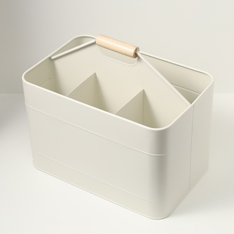 Органайзер Irmel с 4-мя отделениями позволит удобно хранить моющие средства в ванной комнате или на кухне. Благодаря компактным размерам и продуманной конструкции он не займет много места в шкафу, на полке или на полу.Особенности и преимущества:- Использование в изготовлении углеродистой стали увеличенной толщины гарантирует органайзеру отличные эксплуатационные характеристики – устойчивость к повреждениям, износу и простой уход. - Порошковое покрытие защищает металлическую поверхность от коррозии и обеспечивает изделию дополнительную прочность. - Крышка дополнена ручкой из бамбука, что делает дизайн интересным, а эксплуатацию – более комфортной. - Органайзер имеет 4 отделения для удобного хранения различных моющих средств.Материалы: углеродистая сталь, бамбук. Размеры: 32,3х21х29,5 см. Большой отсек: 31,7х9,7х29,5 см. Малые отсеки: 10,6х10,7х29,5 см. Цвет: молочный.Загрязнения рекомендуется удалять при помощи мягкого влажного материала. После очищения органайзер необходимо вытереть насухо. Запрещается использовать абразивы и агрессивную бытовую химию.