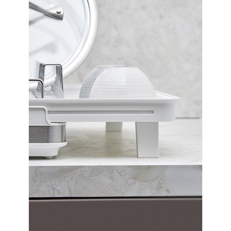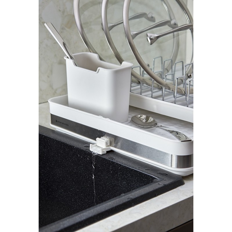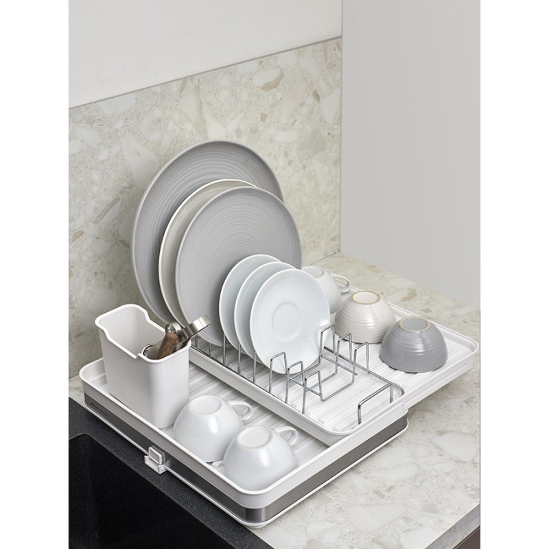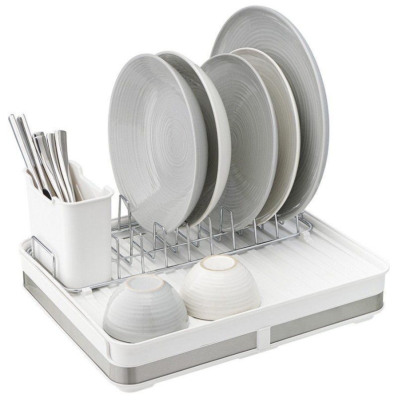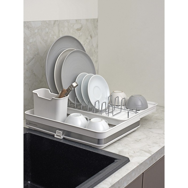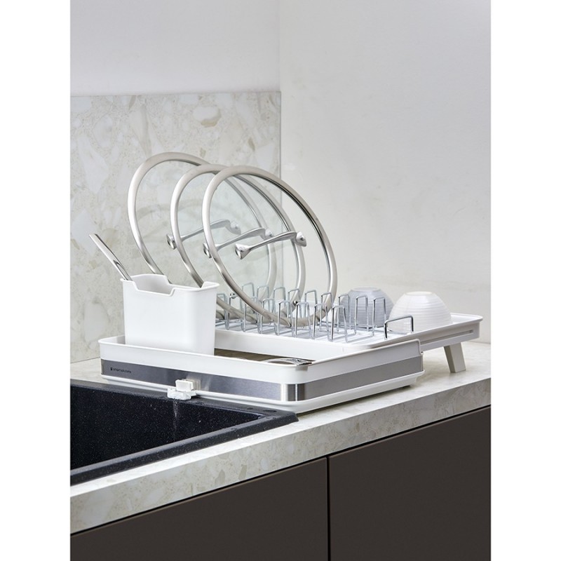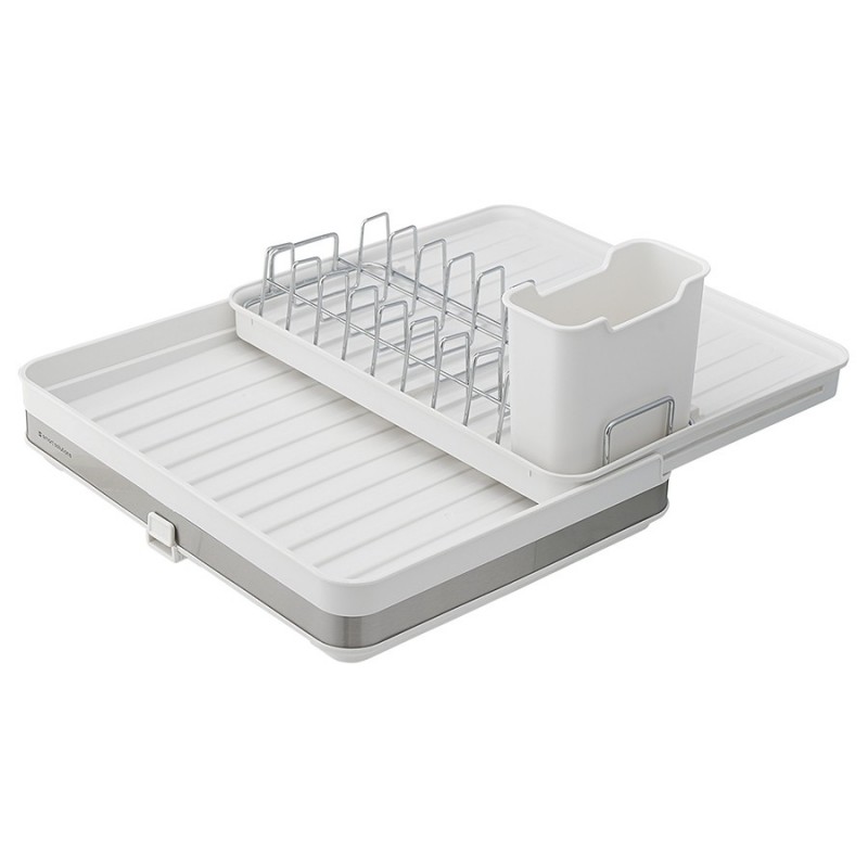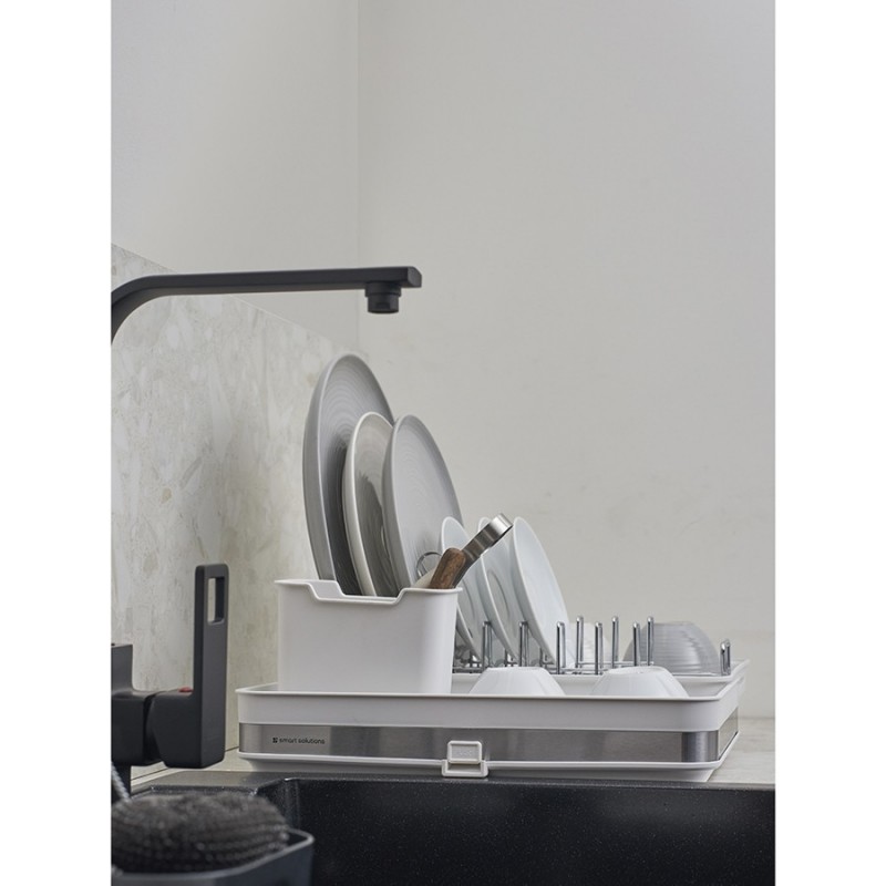 Сушилка Atle – компактная, но в то же время вместительная модель с раздвижной конструкцией, в которой предусмотрены отделения для посуды и кухонных принадлежностей. Удобное размещение и надежную фиксацию тарелок и других емкостей обеспечивают железные разделители. Поддон выполнен из практичного полипропилена, который легко моется. Стальные элементы на корпусе имеют специальное покрытие против отпечатков пальцев. Настольную сушилку можно размещать в любом месте и для ее установки не требуется делать отверстия в стене. Для хорошей устойчивости в раздвижном состоянии предусмотрены специальные ножки, расположенные в нижней части сушилки, которые выдвигаются одним движением руки.Материалы: полипропилен, сталь, железо. Размеры в сложенном виде: 36,3х30,2х16,8 см. Размеры в разложенном виде: 36,3х52х16,8 см. Цвет: белый.Сушилку можно очищать от загрязнений в теплой мыльной воде с помощью мягкой губки. Запрещается использование агрессивной бытовой химии и абразивных материалов.