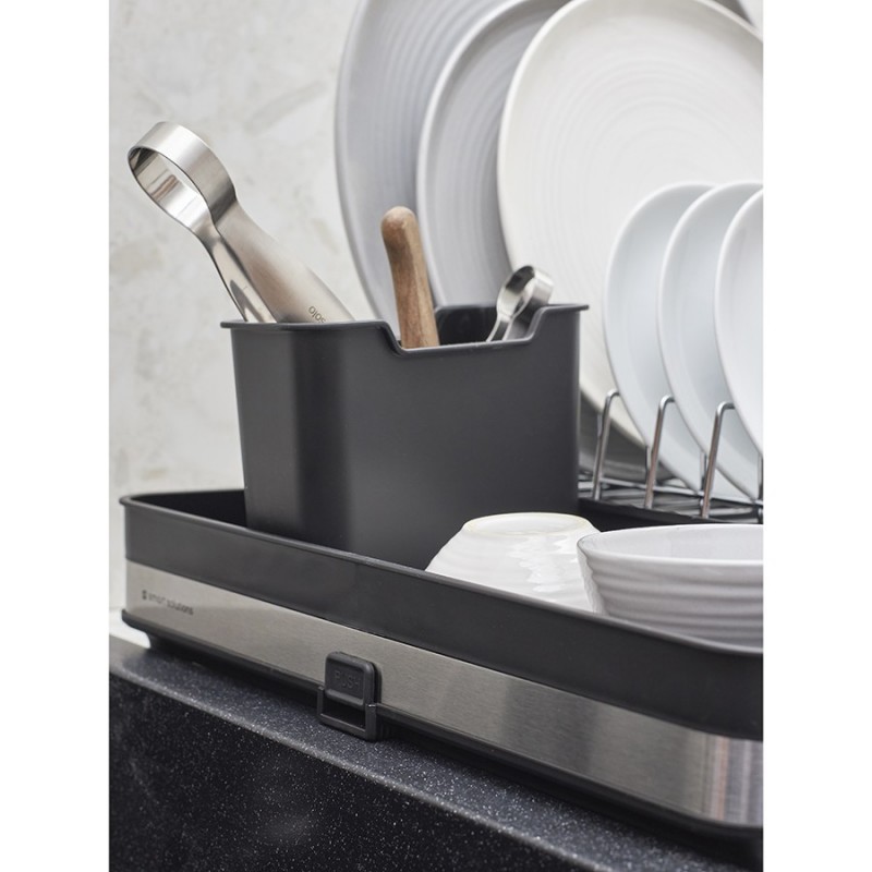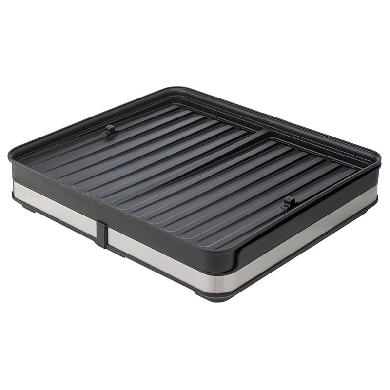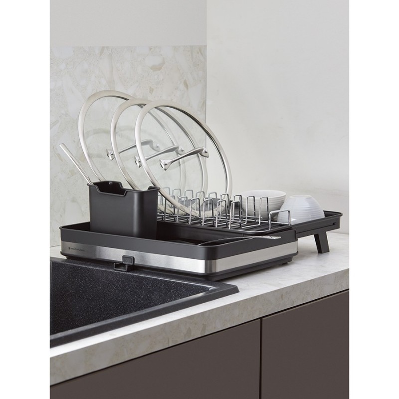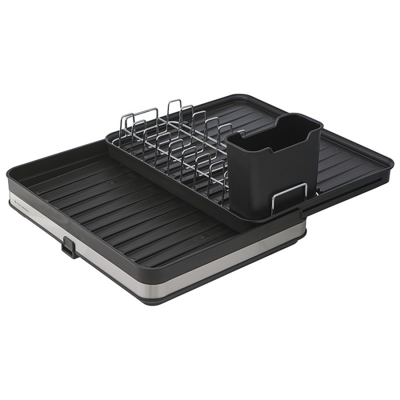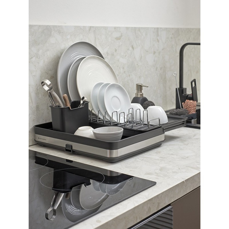 Сушилка Atle – компактная, но в то же время вместительная модель с раздвижной конструкцией, в которой предусмотрены отделения для посуды и кухонных принадлежностей. Удобное размещение и надежную фиксацию тарелок и других емкостей обеспечивают железные разделители. Поддон выполнен из практичного полипропилена, который легко моется. Стальные элементы на корпусе имеют специальное покрытие против отпечатков пальцев. Настольную сушилку можно размещать в любом месте и для ее установки не требуется делать отверстия в стене. Для хорошей устойчивости в раздвижном состоянии предусмотрены специальные ножки, расположенные в нижней части сушилки, которые выдвигаются одним движением руки.Материалы: полипропилен, сталь, железо. Размеры в сложенном виде: 36,3х30,2х16,8 см. Размеры в разложенном виде: 36,3х52х16,8 см. Цвет: черный.Сушилку можно очищать от загрязнений в теплой мыльной воде с помощью мягкой губки. Запрещается использование агрессивной бытовой химии и абразивных материалов.