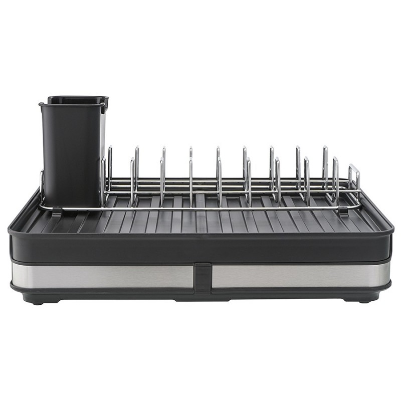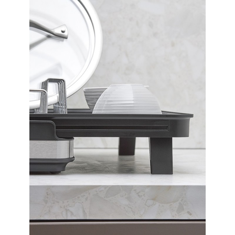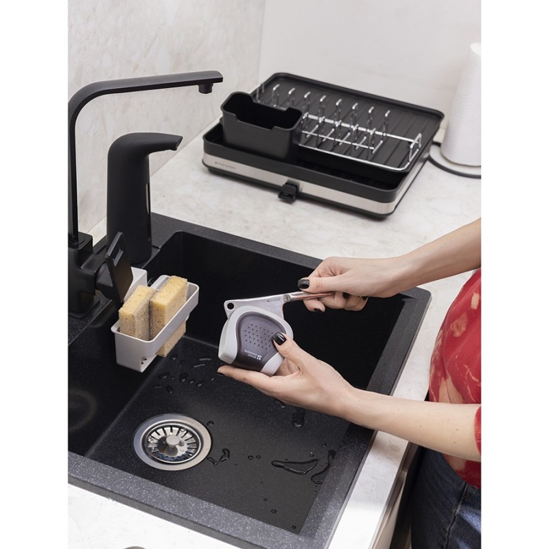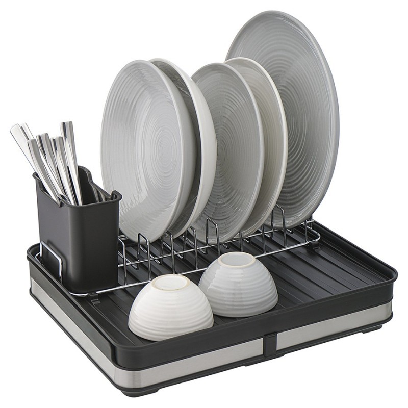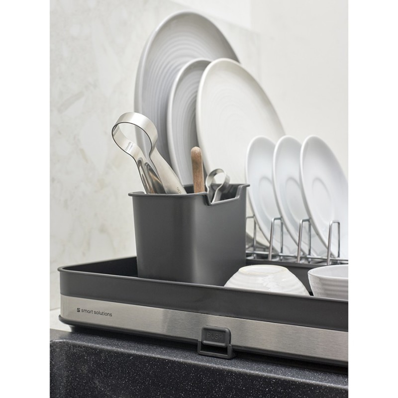 Сушилка Atle – компактная, но в то же время вместительная модель с раздвижной конструкцией, в которой предусмотрены отделения для посуды и кухонных принадлежностей. Удобное размещение и надежную фиксацию тарелок и других емкостей обеспечивают железные разделители. Поддон выполнен из практичного полипропилена, который легко моется. Стальные элементы на корпусе имеют специальное покрытие против отпечатков пальцев. Настольную сушилку можно размещать в любом месте и для ее установки не требуется делать отверстия в стене. Для хорошей устойчивости в раздвижном состоянии предусмотрены специальные ножки, расположенные в нижней части сушилки, которые выдвигаются одним движением руки.Материалы: полипропилен, сталь, железо. Размеры в сложенном виде: 36,3х30,2х16,8 см. Размеры в разложенном виде: 36,3х52х16,8 см. Цвет: черный.Сушилку можно очищать от загрязнений в теплой мыльной воде с помощью мягкой губки. Запрещается использование агрессивной бытовой химии и абразивных материалов.